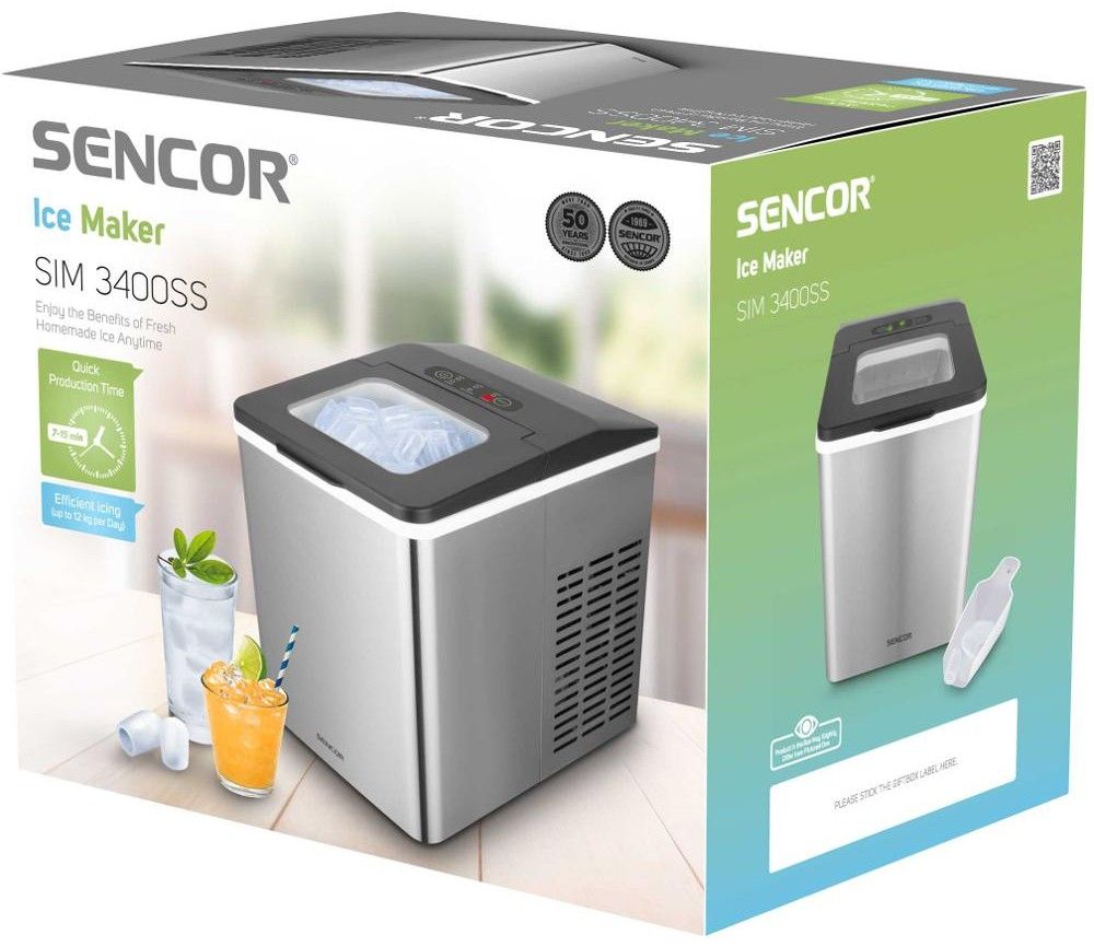 Kompaktní a stylový výrobník ledu do malé kuchyně s odolným tělem z nerezové oceli. Stačí přidat 1,8 l čerstvé vody, stisknout tlačítko a vychutnat si kostky ledu již za 7-15 minut. Ideální pro večírky – vyrobí až 12 kg ledu za den. Můžete si vybrat ze dvou velikostí kostek ledu ve tvaru projektilu. Tichý provoz vám připraví 9 kostek ledu v jednom cyklu a shromáždí je v koši na led o objemu až 500 g. Funkce automatického zastavení zajistí, že se výroba ledu zastaví, když je zásobník plný nebo nádoba na vodu prázdná. Sledujte výrobu ledu přes průhledné víko. Praktická lopatka na led ideální pro doplňování kbelíků na led nebo skladování kostek ledu. Snadné použití díky ovládání jedním tlačítkem. Vypouštěcí ventil pomáhá snadno vyprázdnit nádržku na vodu po skončení přípravy ledu.