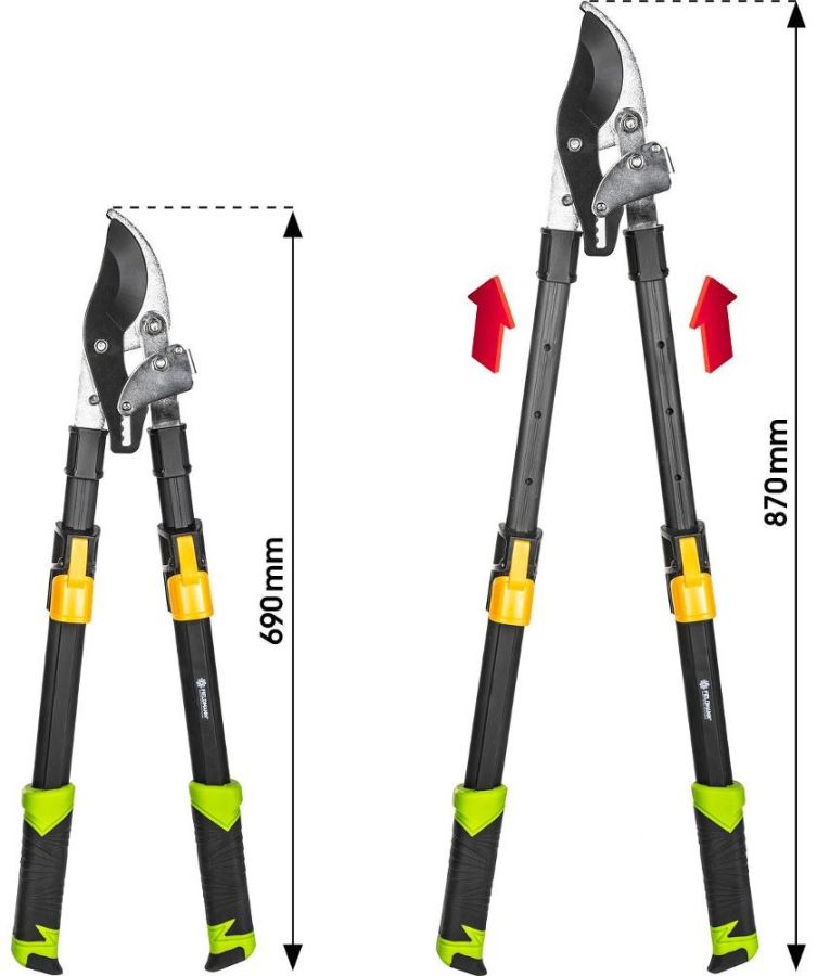 Teleskopické pákové nůžky FZNR 1023 Fieldmann s hmotností 1 570 g jsou ideálním prostředkem, jak efektivně a rychle upravit keře, květiny nebo třeba túje ve vaší zahradě. Délku nůžek si můžete zvolit v rozmezí od 73,5 cm do 85 cm. Zvládnete tak práci i na hůře dostupných místech bez nutnosti použít žebřík.