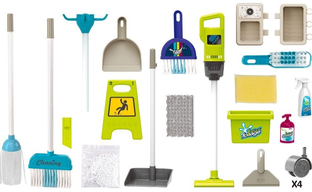 - Úklidový vozík na kolečkách obsahuje vše, co malí pomocníci potřebují pro úklid. Najdou v něm různé čisticí pomůcky a doplňky, se kterými si mohou hrát na uklízeče.