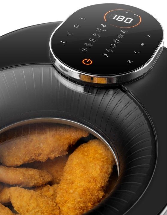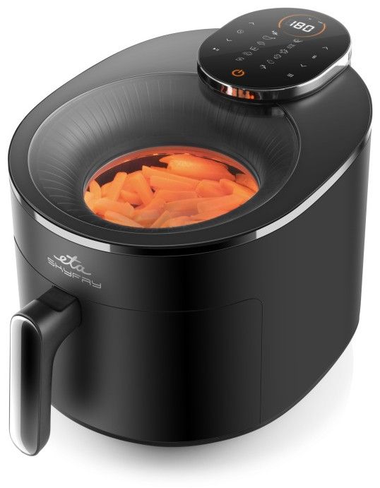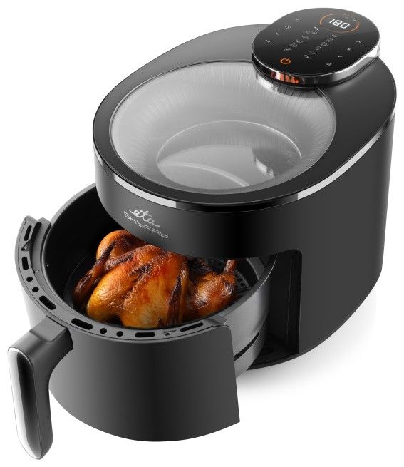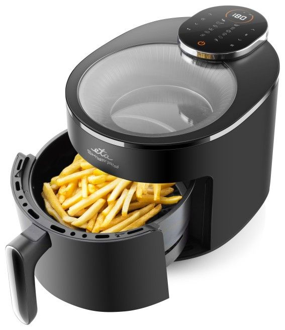 Dopřejte si smažené dobroty bez výčitek! Horkovzdušná fritéza ETA SkyFry s praktickým průhledným horním krytem „smaží“ jídlo pomocí horkého vzduchu a infračerveného topného tělesa, a to rovnoměrně ze všech stran. Díky velké 5litrové nádobě s fritovacím roštem připravíte šťavnaté kuřecí steaky, dozlatova usmažené hranolky, domácí falafel i křupavou zeleninu – a to s minimem přidaného tuku.