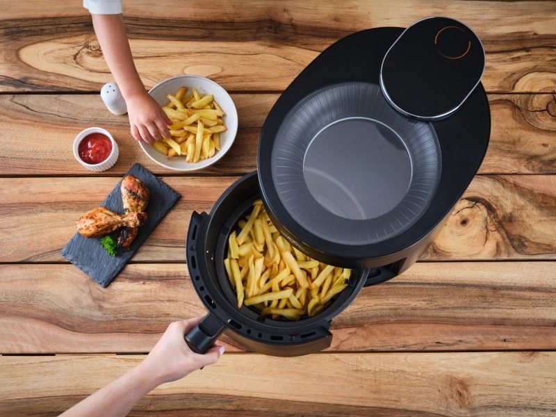 Horkovzdušná fritéza zajišťuje systém fritování bez použití oleje. Objem fritovacího koše 5 l.
