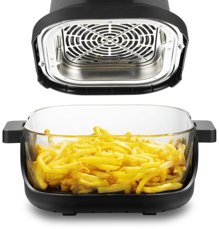 Horkovzdušná fritéza zajišťuje systém fritování bez použití oleje. Má 2 nádoby s objemem 4 l a 1,5 l.