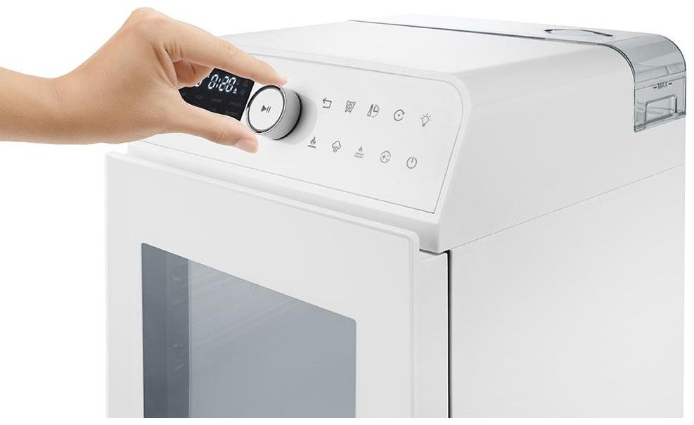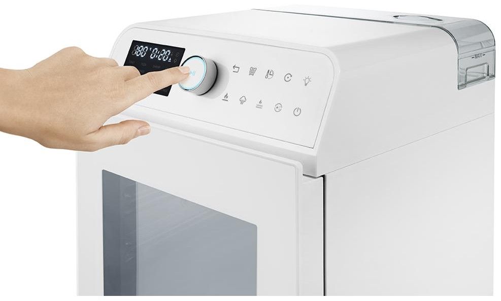 Horkovzdušná fritéza, vaření v páře, zajišťuje systém fritování bez použití oleje. Objem nádoby 15 l a dotykový LED displej s otočným knoflíkem.