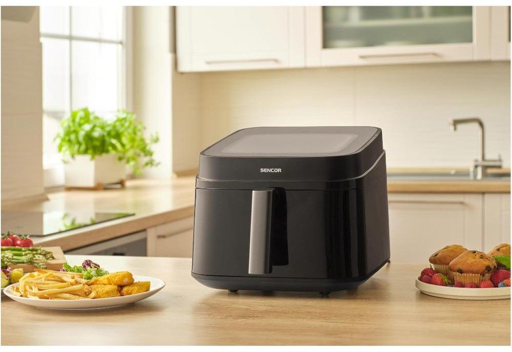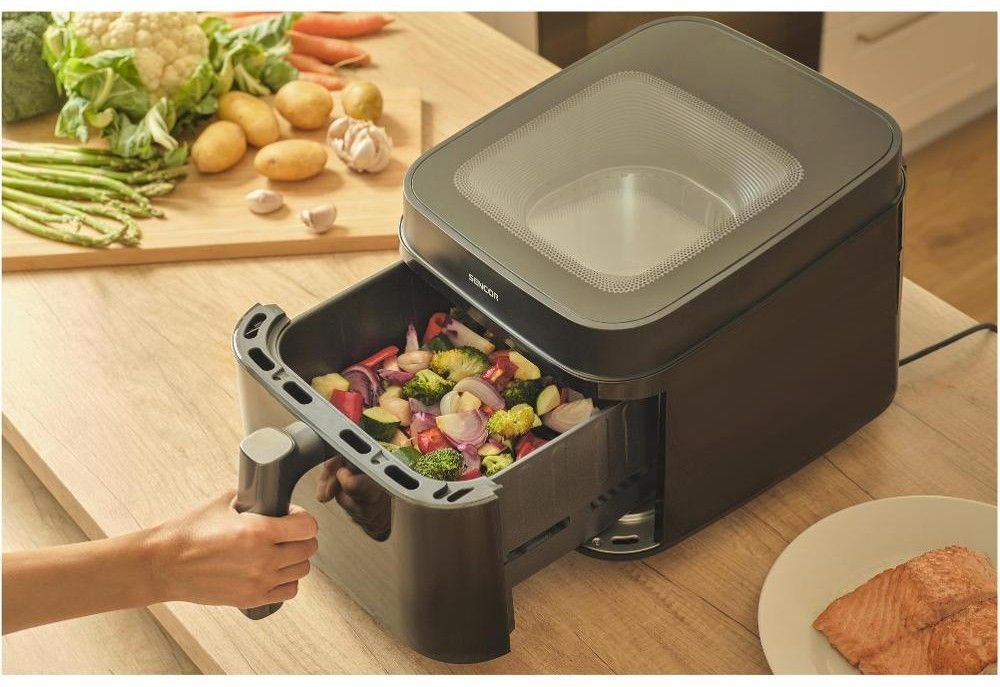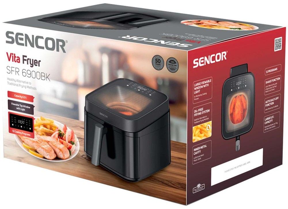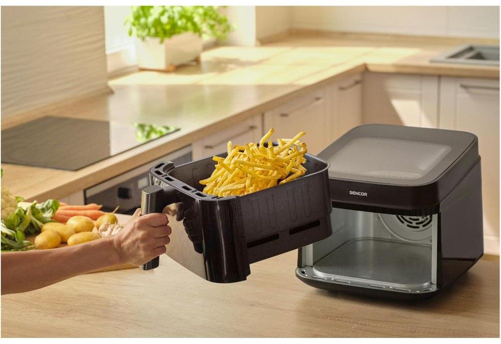 Horkovzdušná fritéza Sencor SFR 6900BK je vybavena velkým náhledovým oknem umístěným v její horní části. K vaření fritéza využívá důmyslnou technologii cirkulace horkého vzduchu. Tradičně smažené pokrmy tak připraví mnohem zdravěji s minimem oleje a bez nepříjemného zápachu. K dispozici je koš o objemu 6,5 l. Intuitivní obsluhu zajišťuje dotykový LED displej.