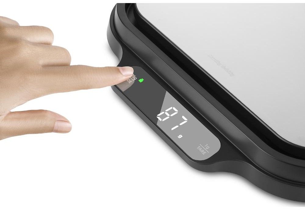 Kuchyňská váha je vybavena vysoce přesným tenzometrickým senzorovým systémem, dotykovým displejem a funkcí Tare.