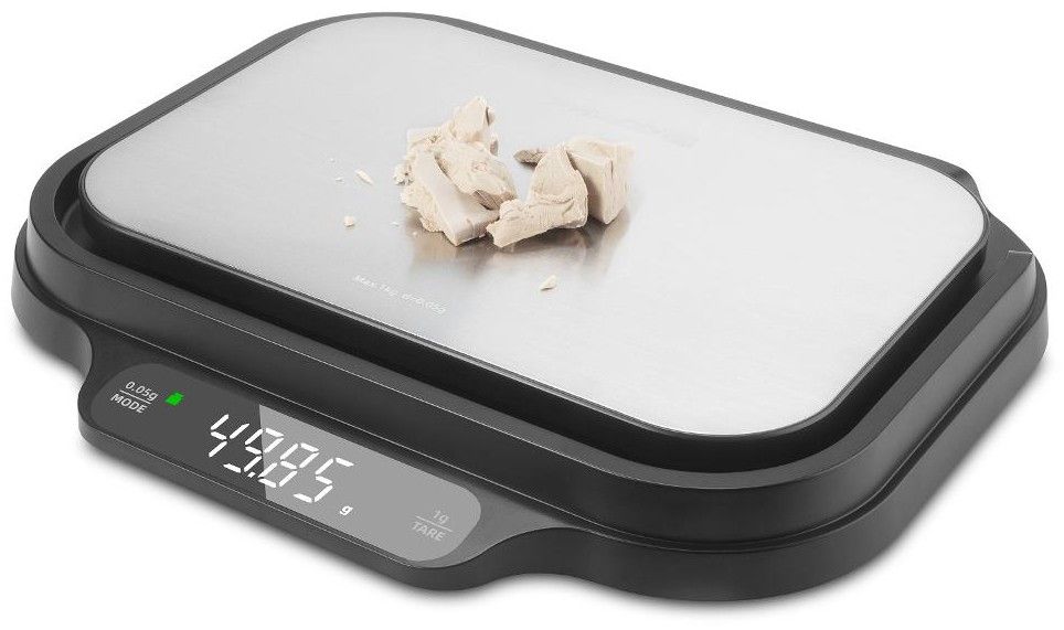 Jedna váha, dva režimy vážení – pro vždy přesné výsledky při jemném i objemném vážení. Díky dvojímu systému zvládne váha precizní vážení menších množství až do 1 kg s rozlišením 0,05 g, stejně jako spolehlivé vážení objemnějších surovin do 15 kg s rozlišením 1 g.