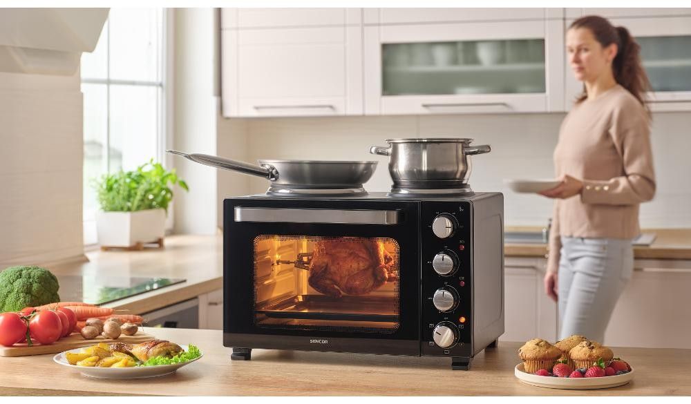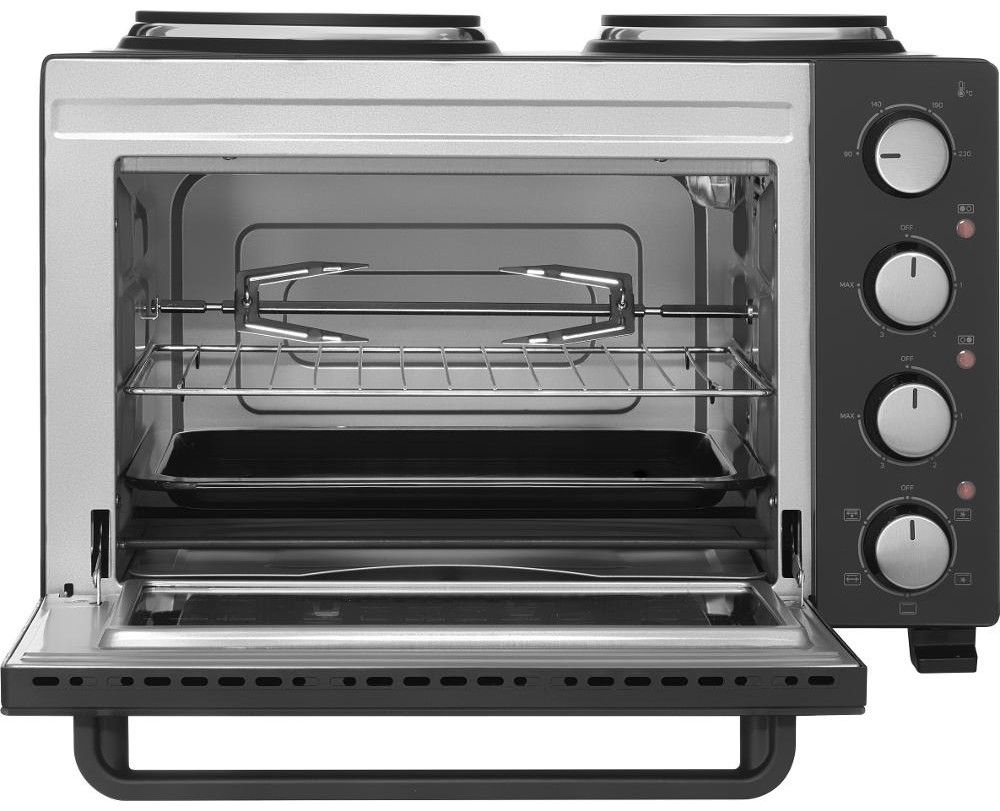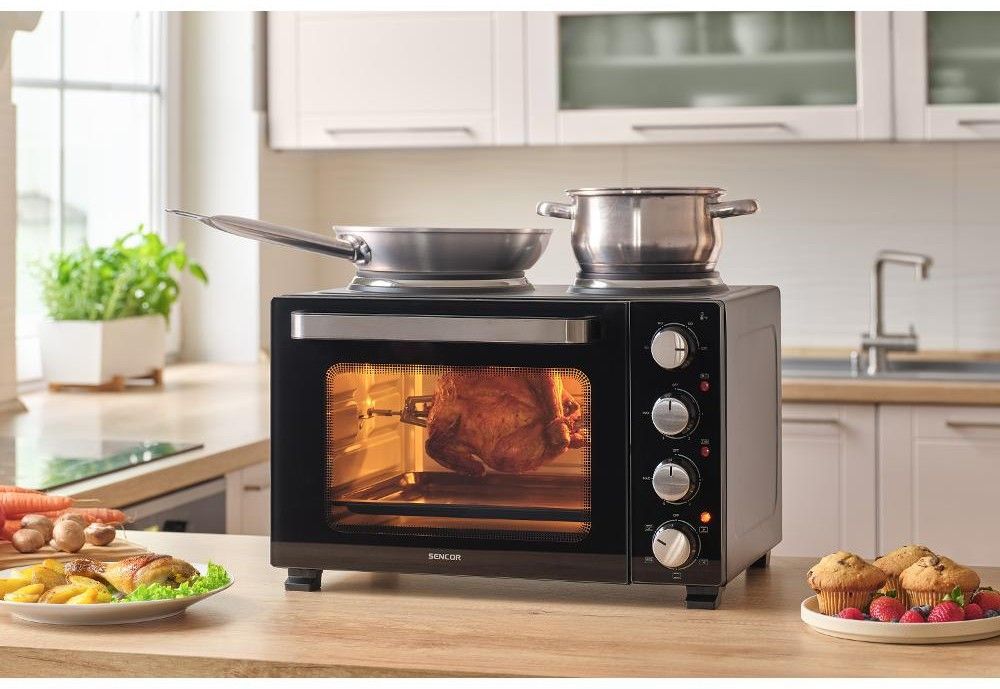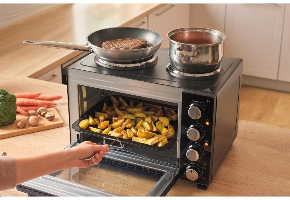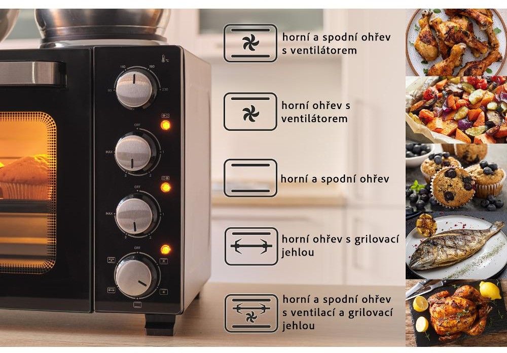 Elektrická mini trouba o objemu 28 litrů s otočným ovladačem s 5 volitelnými programy a integrovaným vnitřním osvětlením.