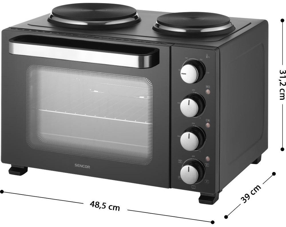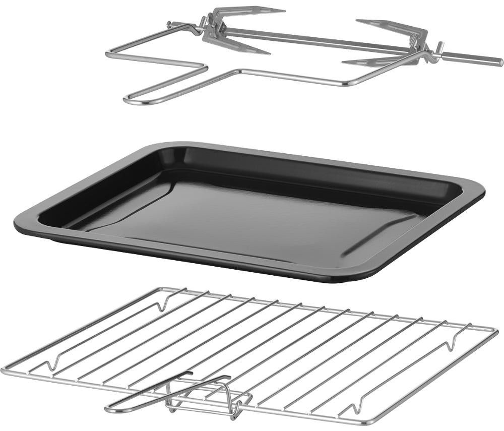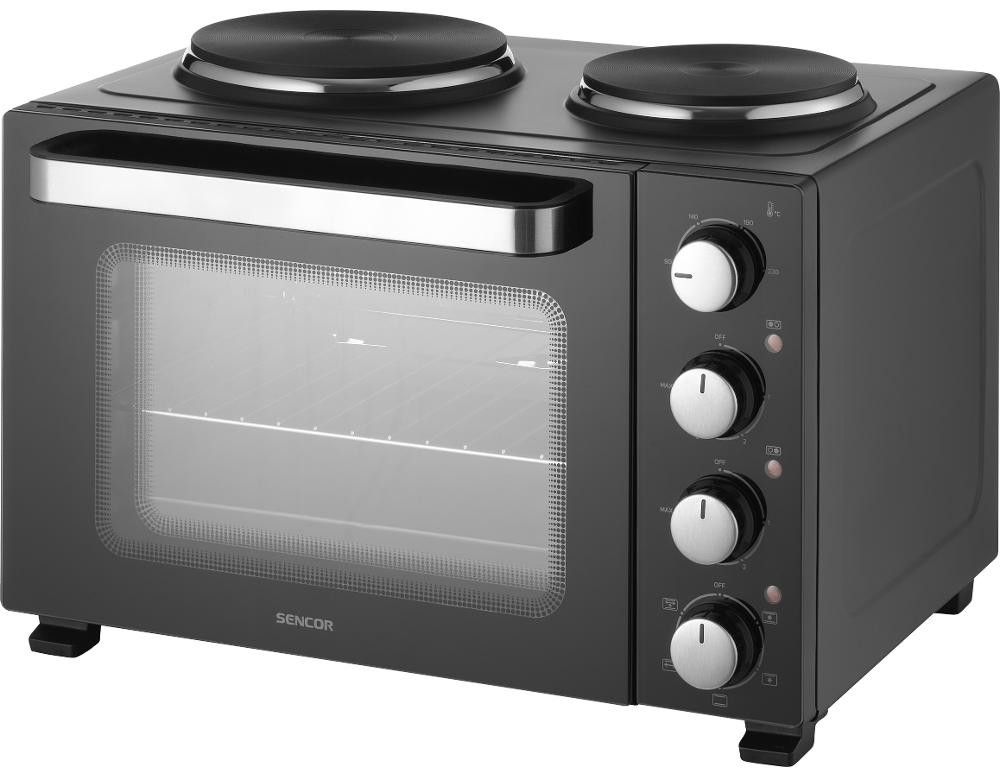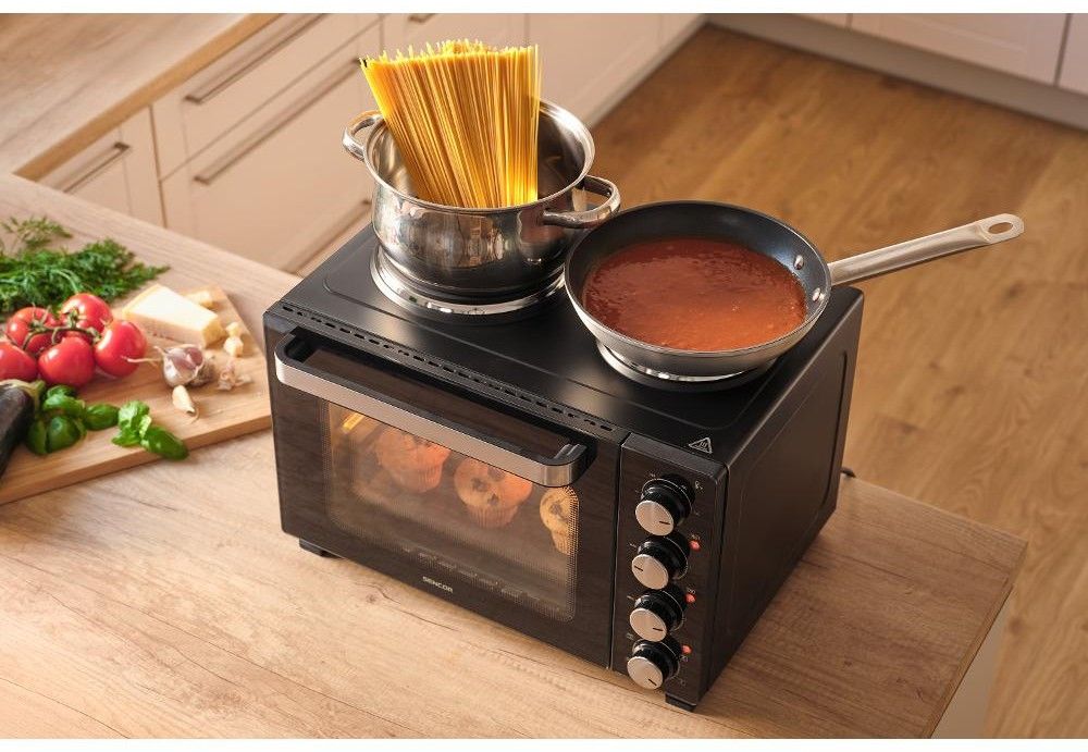 Elektrická mini trouba o objemu 28 litrů s otočným ovladačem s 5 volitelnými programy a integrovaným vnitřním osvětlením.
