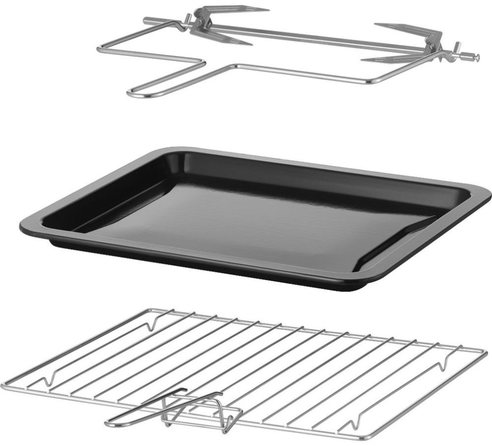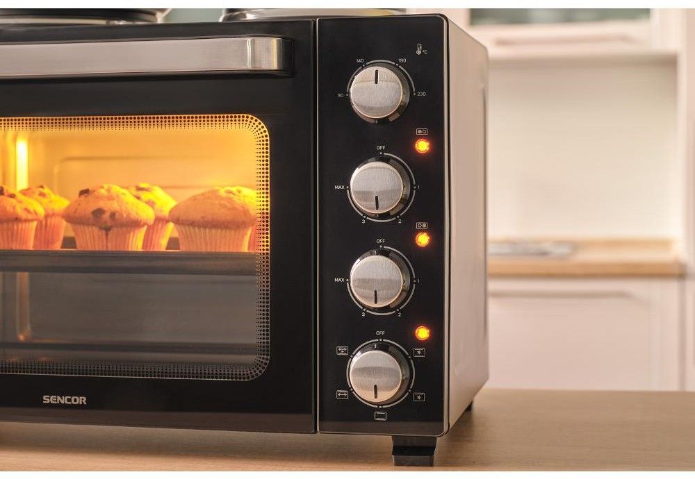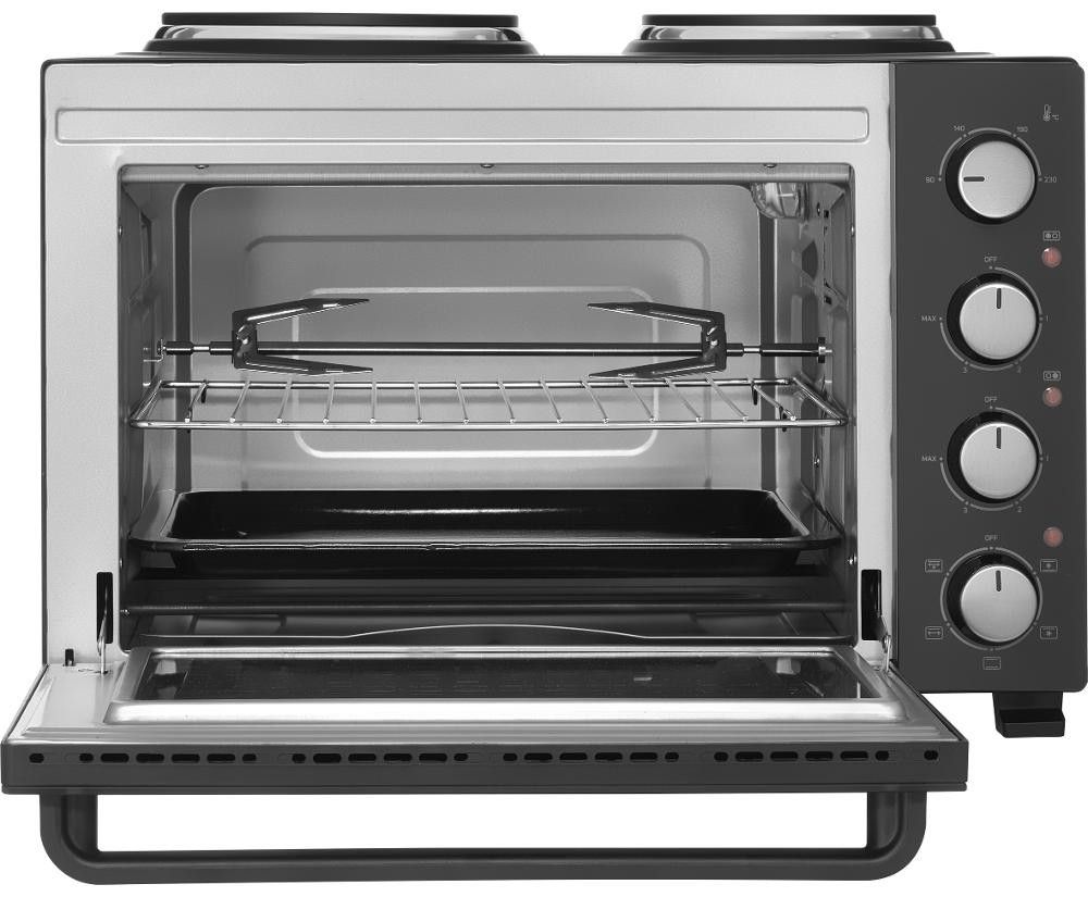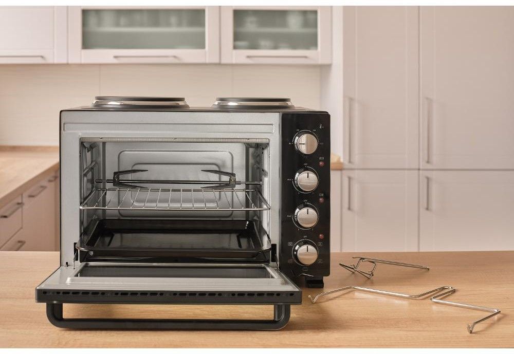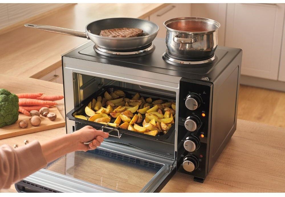 Elektrická mini trouba o objemu 35 litrů s otočným ovladačem s 5 volitelnými programy a integrovaným vnitřním osvětlením.