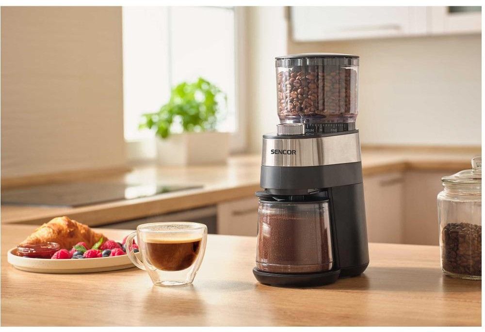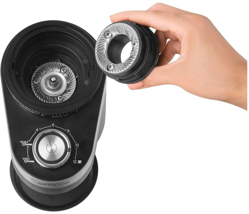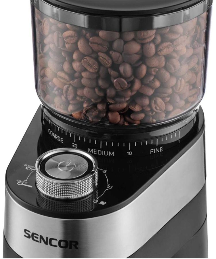 Elektrický mlýnek na kávu má mlecí kameny z oceli které zajišťující rychlé a přesné mletí, 30 nastavení mletí od jemného po hrubé a otočný volič pro nastavení porcí od 1 do 12 šálků s funkcí automatického zastavení.