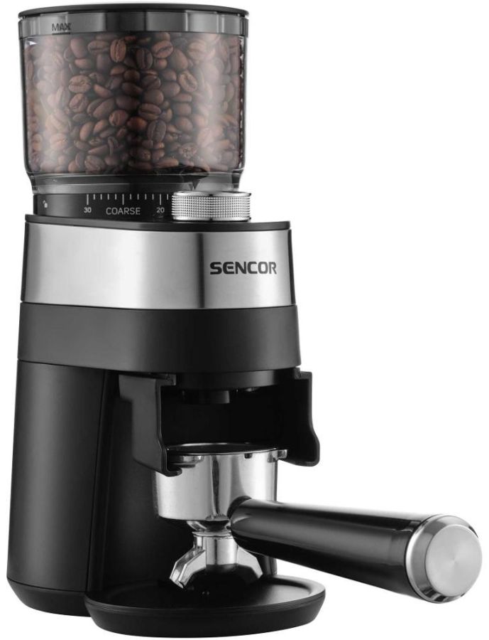 Obsah balení: Elektrický mlýnek na kávu, Držák na portafiltr, Krabička na zrnkovou kávu, Nádoba na kávový prášek, Čisticí kartáček