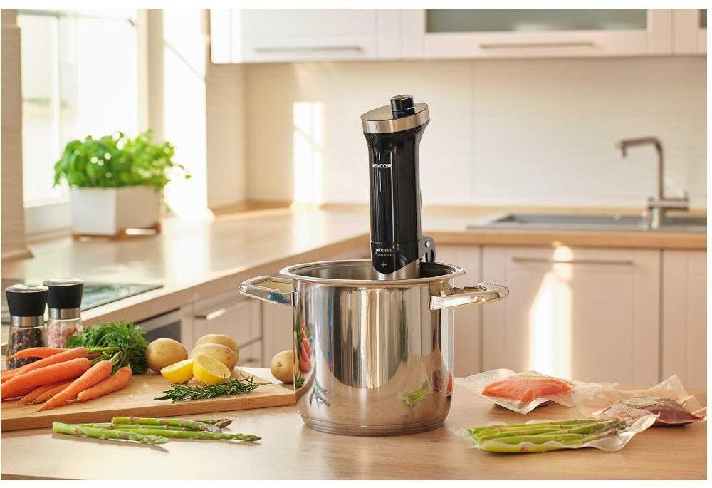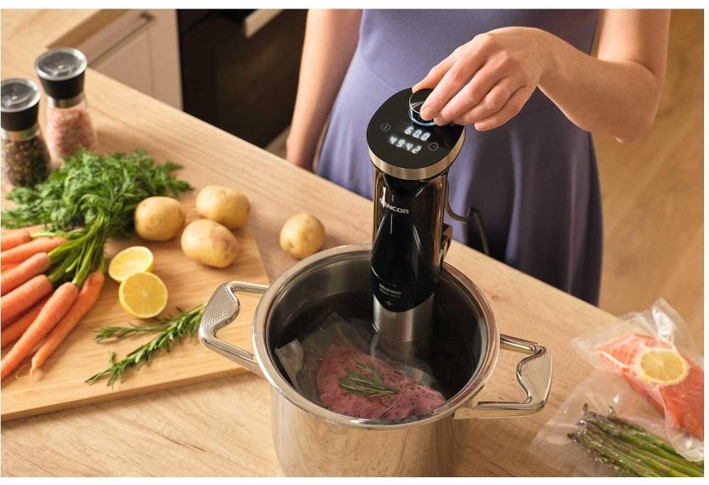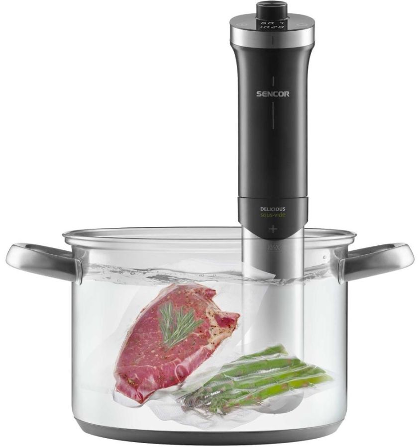 Slyšeli jste už o přípravě jídla pomocí metody sous vide? Jedná se o vaření při konstantní nízké teplotě, přičemž ingredience musíte nejprve zavakuovat do speciálního plastového sáčku. Poté přístroj, připomínající dámskou kulmu na vlasy, ponoříte do hrnce se zavakuovanými potravinami, přidáte vodu a o ostatní se už zařízení postará samo. Jídlo si zachovává svou vůni, chuť, barvu i šťavnatost. Nerozvařuje se, ani nepřipaluje.