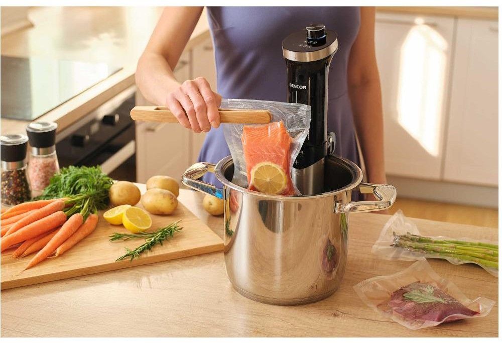 Speciální metoda sous vide je ideální pro přípravu ryb, masa a zeleniny. Jde o zdravější a chutnější variantu vaření, než při běžném pečení nebo smažení. Není totiž třeba přidávat žádné nezdravé tuky či oleje. Jídlo budete vařit při konstantní nízké teplotě ve speciálním vakuovém sáčku.