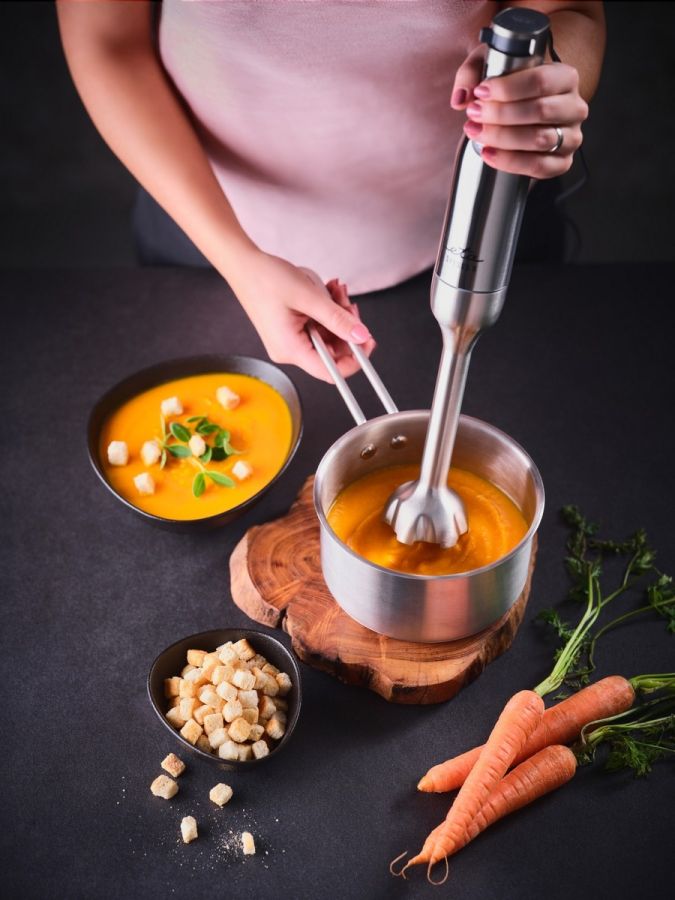 Tyčový ponorný mixér s DC motorem, ergonomickou rukojetí a bohatým příslušenstvím.