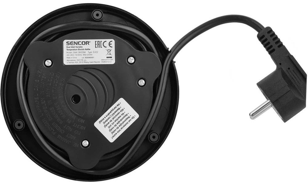 Obsah balení: Rychlovarná konvice, 360° základna s úložným prostorem pro napájecí kabel, Vyjímatelný filtr proti vodnímu kameni