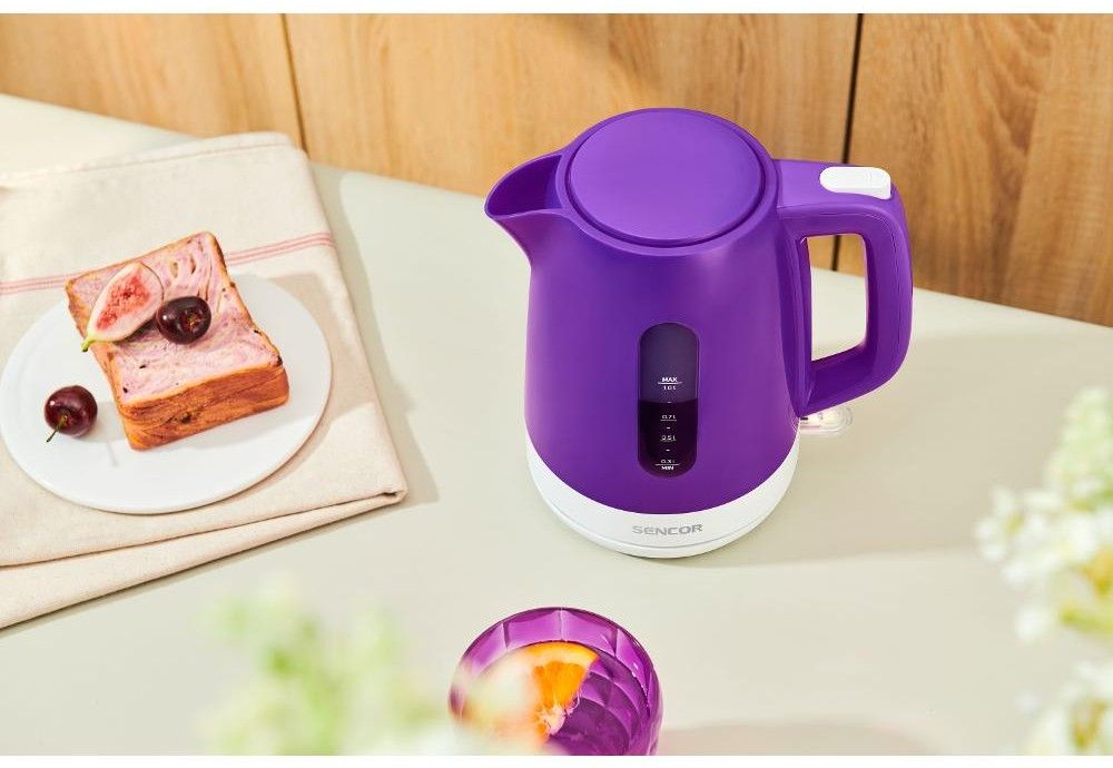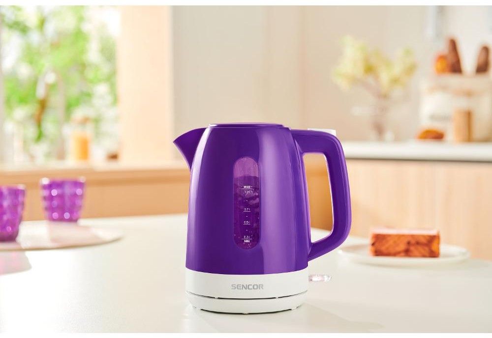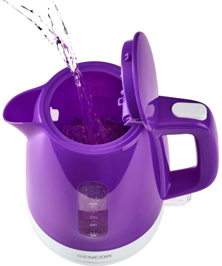 Plastová rychlovarná konvice o objemu 1 l. Má průhledný vodoznak, světelnou signalizaci provozu a skryté topné těleso.