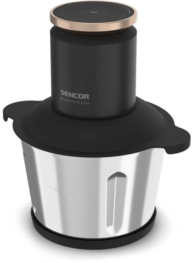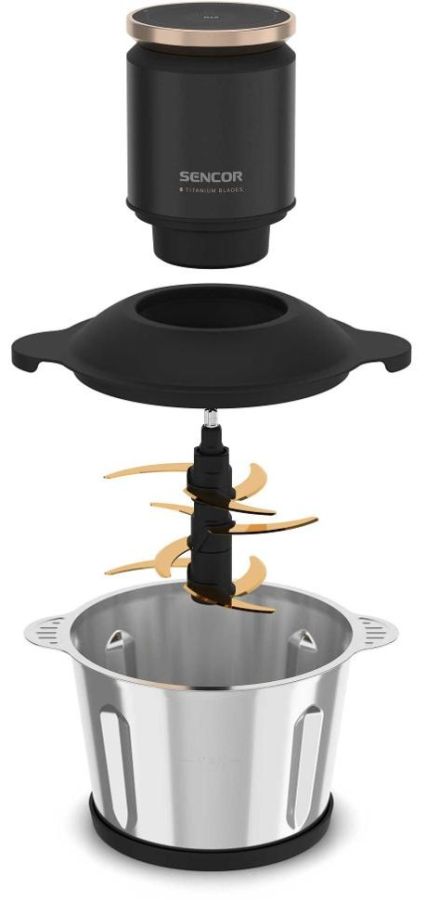 Sekáček má výkonný 800W motor, 9 titanových nožů a nádobu z nerezavějící oceli o objemu 3 l.