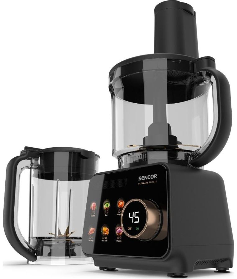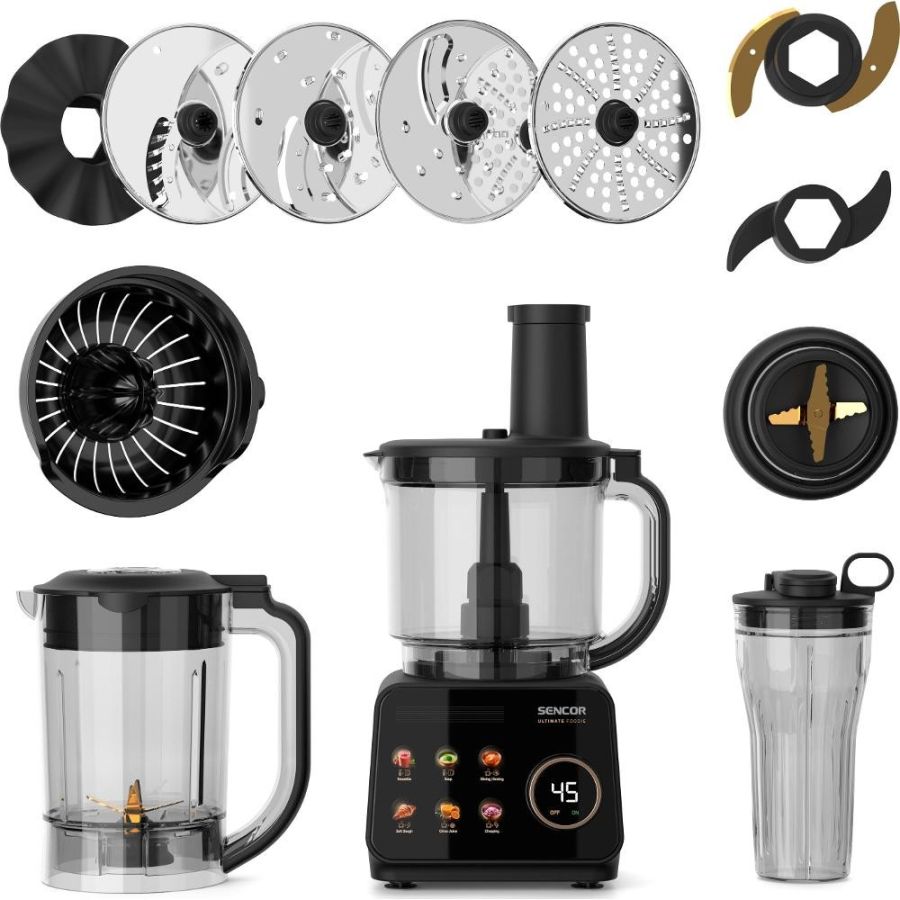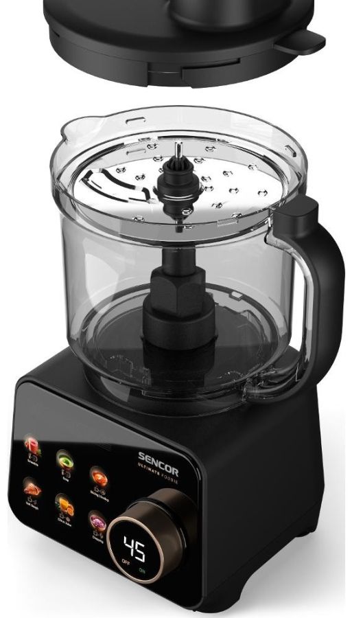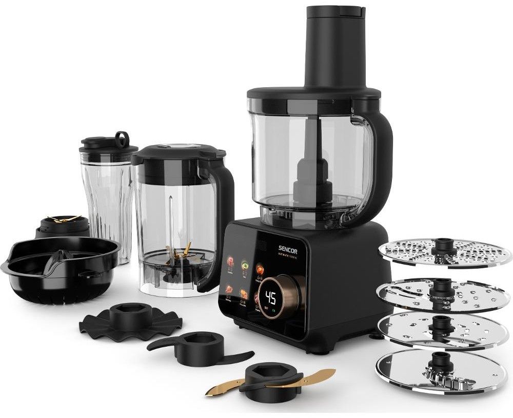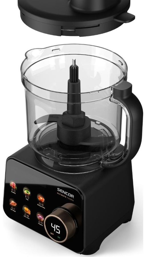 Univerzální food processor 5v1 s extra výkonným motorem 1 500 W, barevným LED dotykovým ovládacím panelem s otočným regulátorem rychlosti a titanovým povrchem nožů.