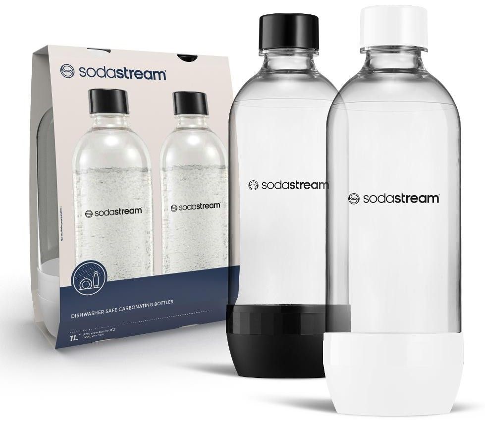 Náhradní balení láhví 1l na výrobník Sodastream Jet, Genesis, Fizz, Dynamo, Revolution, vhodné do myčky. Balení obsahuje 2 ks lahví.