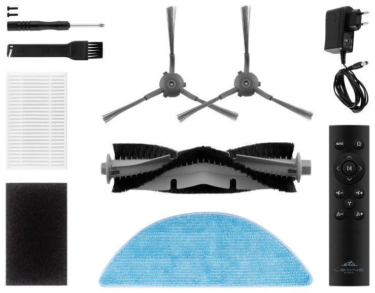 Příslušenství součástí balení: Nabíjecí stanice, Dálkový ovladač (včetně 2 ks AAA baterií), 1x hlavní kartáč (instalovaný), 2x postranní kartáček (1x instalovaný, 1x náhradní), Nástavec na mopování, 2x mopovací textilie, 2x HEPA filtr (1x instalovaný, 1x náhradní), 2x molitanový filtr (1x instalovaný, 1x náhradní), Nástroj na čištění