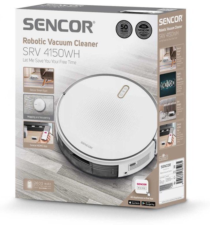 Hledáte pomocníka, který se před nepořádkem nezastaví? Inteligentní robotický vysavač Sencor SRV 4150WH s výkonným digitálním motorem se sací sílou 3000 Pa si poradí s koberci i všemi typy tvrdých podlah, umí zároveň vysávat i mopovat. Díky gyroskopické navigaci chytře volí optimální trasu úklidu a po dokončení práce se sám vrátí do nabíjecí stanice. Li-Ion baterie s kapacitou 2 600 mAh zajistí na jedno nabití až 130 minut provozu. Nízký profil 7,6 cm robotovi umožní dostat se i pod nábytek, zatímco inteligentní senzory zabrání nárazům a pádům. Ovládání je snadné skrz dálkový ovladač nebo mobilní aplikaci Sencor HOME. Úklid tak můžete řídit odkudkoli.