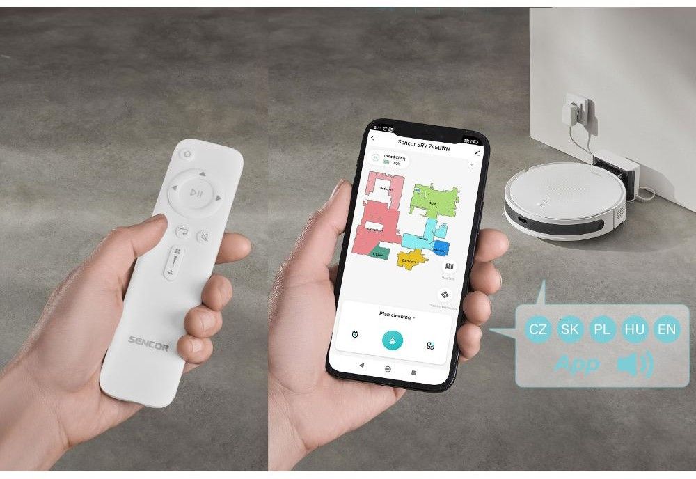 K ovládání můžete využít dálkový ovladač nebo aplikaci Sencor Home v mobilním telefonu. Připojení přes Bluetooth navíc poskytuje snadné a rychlé spárování. Všechny funkce lze tak aktivovat třeba přímo z práce nebo chaty a na svém zařízení průběžně sledovat úklid vaší domácnosti.