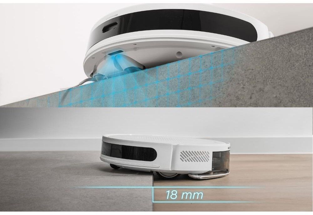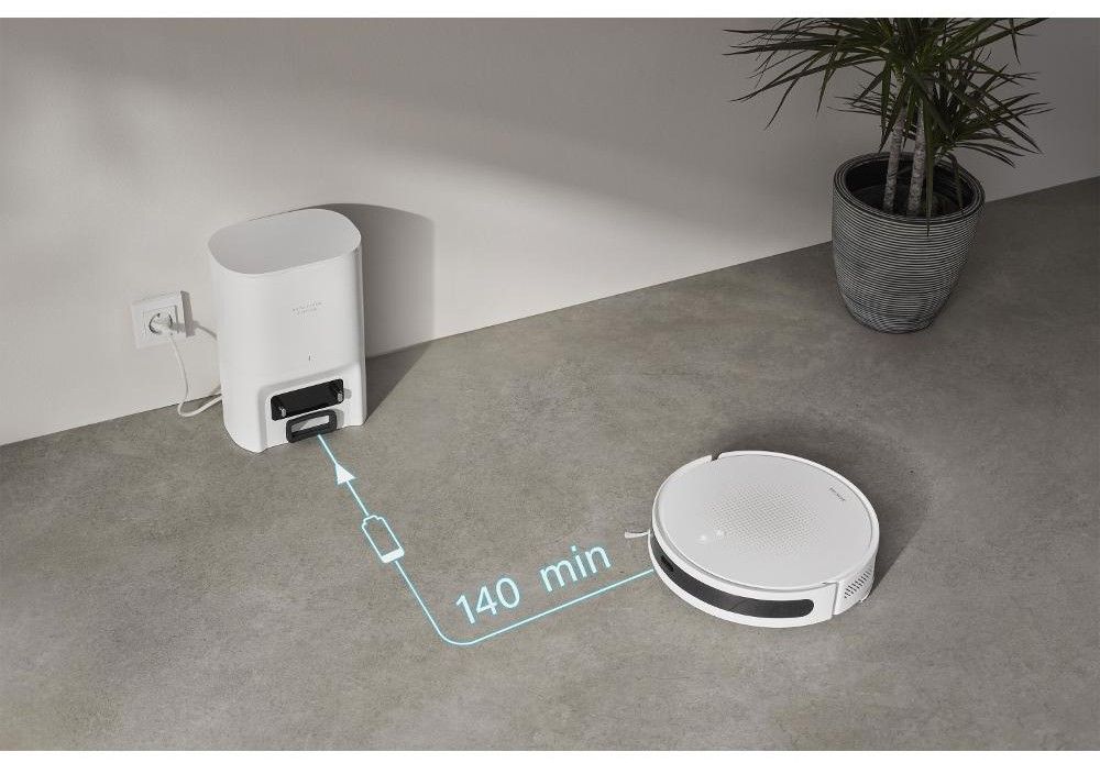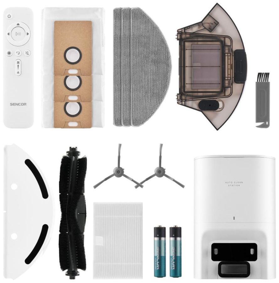 Obsah balení: Robotický vysavač včetně bočního kartáče a filtrů, Nabíjecí stanice, Dálkový ovladač, Mopovací nástavec, 3× mopovací návlek, Náhradní boční rotační kartáč, Náhradní HEPA filtr, Náhradní molitanový filtr, Čisticí kartáček, 2× baterie typu AAA