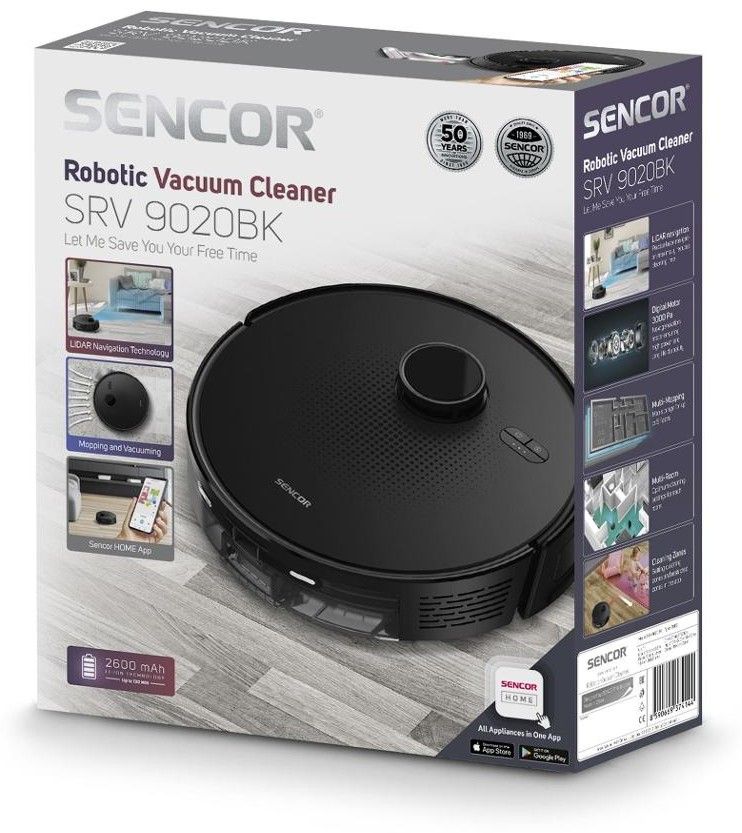 Sencor SRV 9020BK je inteligentní robotický vysavač, který zároveň mopuje a vysává. S výkonným motorem se sací sílou 3 000 Pa se můžete spolehnout na dokonalé výsledky. Li-Ion baterie s kapacitou 2 600 mAh zajistí na jedno nabití fungování až po dobu 130 minut. Dokonalou orientaci v prostoru zajisťuje řada chytrých senzorů a laserová navigace Lidar. Díky ní si můžete jednoduše naplánovat úklid v jednotlivých místnostech, ale i nastavit zakázané zóny. K ovládání vám poslouží dálkový ovladač nebo mobilní aplikace Sencor Home. Umožněno je jednoduché spárování pomocí Bluetooth.