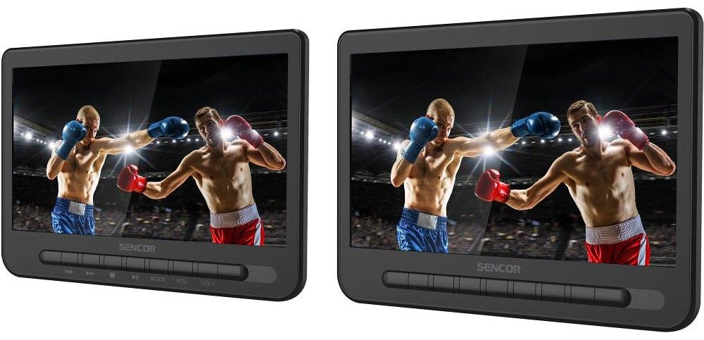 Přenosný DVD přehrávač s 2x 10" LCD displejem, slotem na kartu SD, USB a rodičovkým zámkem.