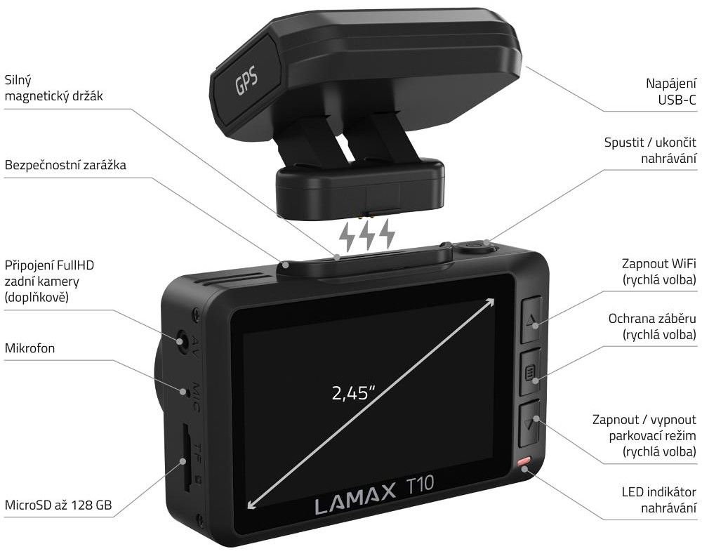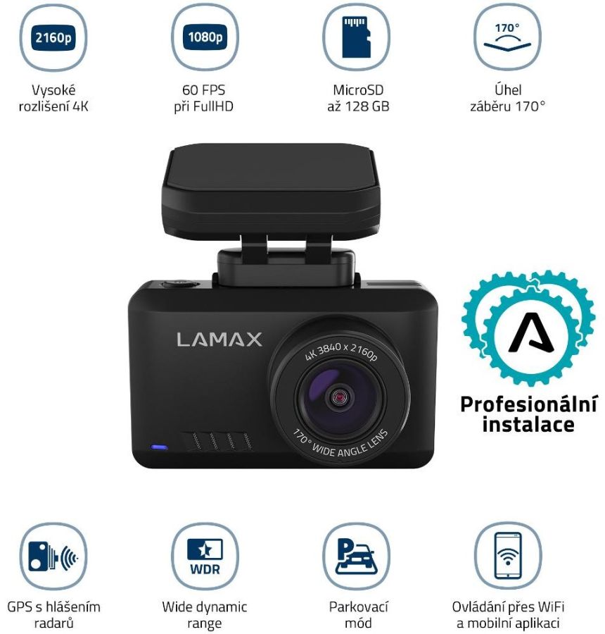Autokamera 4K (3840×2160), 2,45" displej, hlášení radarů a vestavěný mikrofon s možností vypnutí jedním tlačítkem.