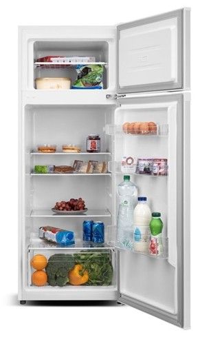 Chladnička s mrazákem nahoře o celkovém užitném objemu 206 l. Objem chladničky 169 a objem mrazničky 37 l.