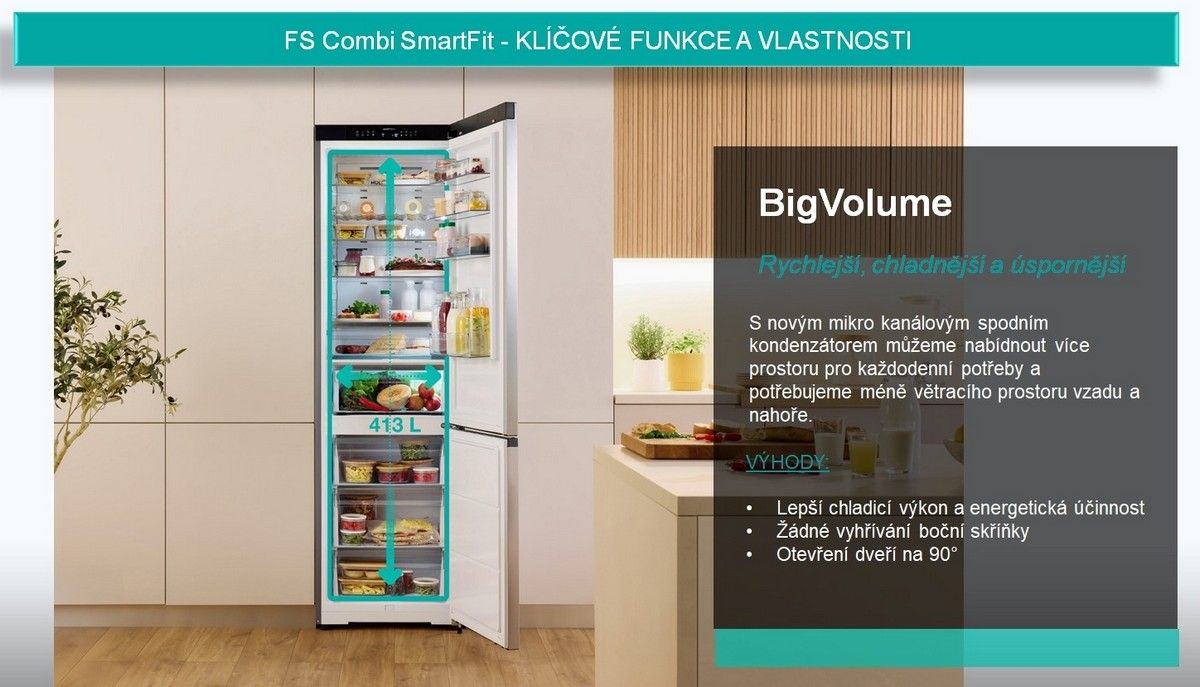 Užijte si největší úložný objem ve své třídě s velkorysými 413 litry, ideální pro rodiny nebo týdenní nákupy. Potraviny jakéhokoli tvaru a velikosti uložíte bez námahy a získáte lepší přehled i organizaci. Prostorný interiér snadno pokryje všechny vaše potřeby na skladování. Díky technickým vylepšením je instalace nyní jednodušší a flexibilnější s designem SlotIn.