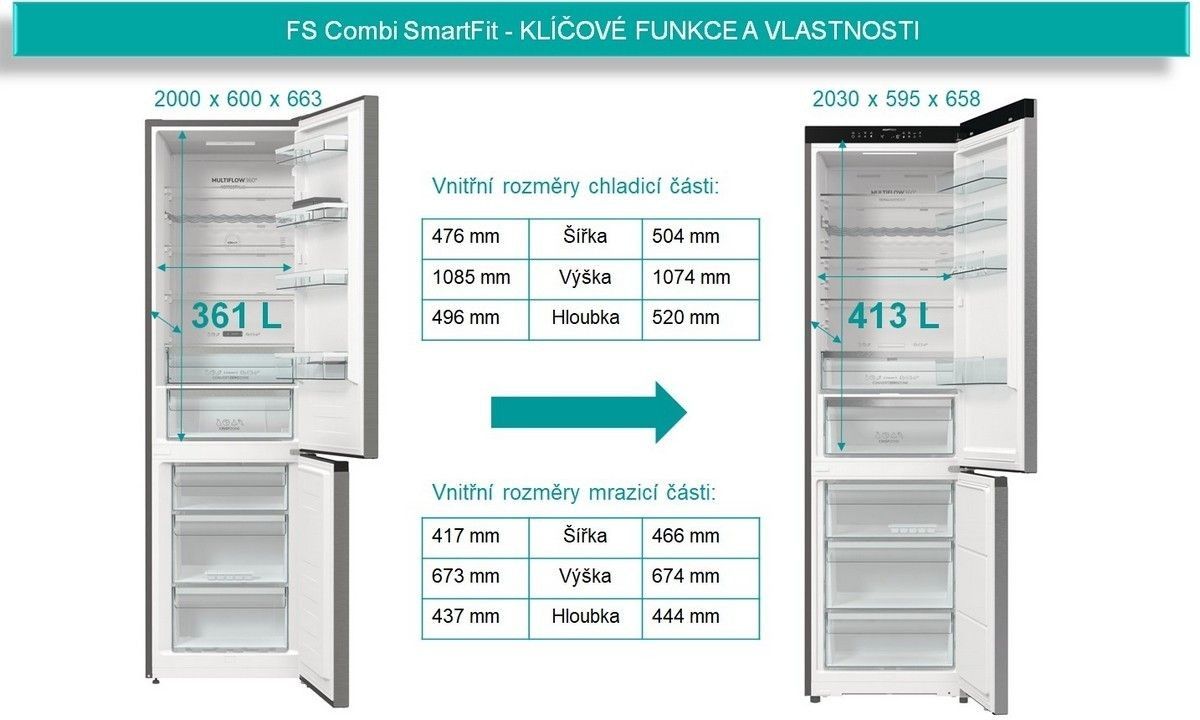 Kombinovaná chladnička o celkovém užitném objemu 413 l. Objem chladničky 283 l a objem mrazničky 130 l.