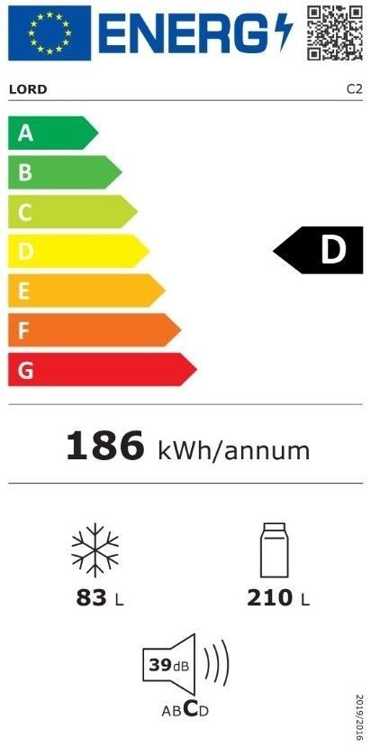 Volně stojící chladnička LORD C2 v bílé barvě se se svou spotřebou 186 kWh za rok řadí do úsporné energetické třídy D.
