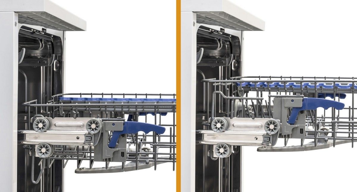Myčka zvládne najednou 10 jídelních sad. Je vnitřně uspořádána tak, aby se každý kousek nádobí dokonale umyl a vysušil. Nádobí můžete vkládat do tří úrovní, přičemž jedna z nich je určena především na příbory. Ty kolem sebe budou mít spoustu místa a voda i čisticí prostředek se k nim jednoduše dostane. Horní koš je výškově nastavitelný a to i při plném naplnění a je tedy možné rychle zvýšit prostor nad spodním košem pro objemnější nádobí.