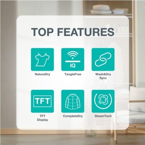 - Další vlastnosti: Anticrease systém proti mačkání prádla, Poloviční plnění, Nastavení úrovně sušení. Odložený start