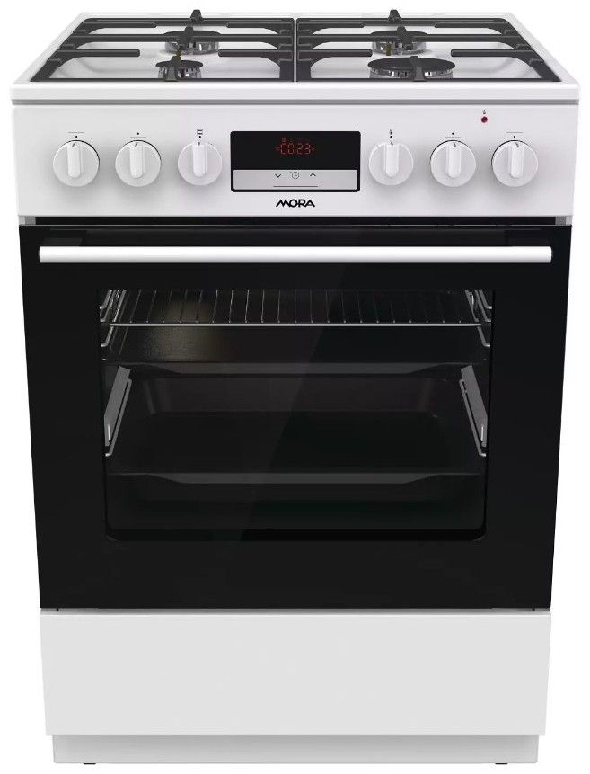Kombinovaný sporák Mora K 8668 B1W6, v šířce 60 cm, v bílém provedení s multifunkční troubou v objemu 71 l Vás překvapí energeticky úspornou třídou A. Plynové hořáky s pojistkami STOP GAS a integrovaným zapalováním jsou kryté dvoudílnou mřížkou STABIL PLUS, která zajišťuje bezpečný posun nádobí ve všech směrech. Díky digitálnímu časovému spínači s hodinami se Vám již nikdy nespálí oběd, tato praktická funkce Vám přinese mnoho užitku. Lze nastavit odložený start a ukončení pečení, pouze ukončení pečení a minutka, samozřejmostí je nastavený aktuální čas. Disponuje funkcí páry, kterou ocení především příznivci zdravé výživy. Připravíte s ní jídla rychle a šetrně, takže si zachovají maximum vitamínů a stopových prvků. Dále je trouba vybavená 11 pečicími programy, které jsou navržené přesně podle potřeb konkrétních jídel. Vykouzlíte například výbornou pizzu jako z italské restaurace (program Pizza), pomalu upečete pečínku a efektivně rozmrazíte hotové porce jídla. Pokud si rádi pochutnáváte na hranolkách nebo kuřecích nugetách, ale nedopřáváte si je tak často kvůli vysoké kalorické hodnotě, můžete také zkusit program pro horkovzdušné fritování bez tuku. Hotovky většinou volíme tehdy, když nás tlačí čas. Zvykli jste si, že předehřátí trouby trvá celou věčnost? Na to teď zapomeňte. Tato trouba se předehřeje na 200 ˚C do 5 minut, což je mnohem rychleji, než bývá zvykem. Nové bezpečné závěsy dvířek zaručují bez Vaší asistence velmi tiché a šetrné zavírání dvířek trouby. Pro zvýšení komfortu obsluhy je trouba vybavená teleskopickým výsuvem, které umožní bezpečnou manipulaci s připravovaným jídlem, aniž byste ho museli z trouby vytáhnout. Ve spodní části sporáku je praktický úložný prostor, do kterého snadno uložíte příslušenství v podobě roštu, mělkého plechu a MAXI pekáče XXL o objemu až 8 l. Perfektní vyčištění vnitřního prostoru po každém pečení zajistí funkce ECO CLEAN, díky které odstraníte i větší nečistoty bez nutnosti použít čisticí prostředek.