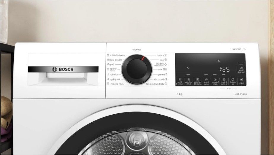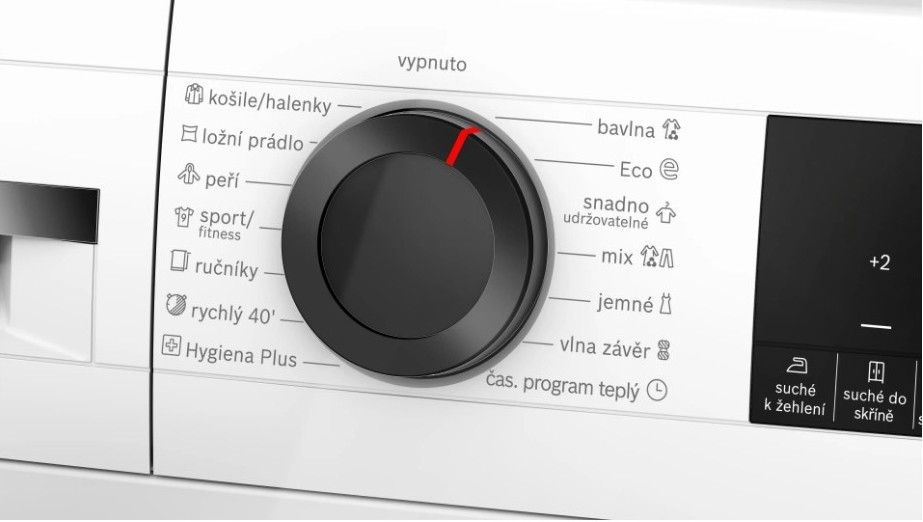 - Další možnosti ovládání: bavlna, povlečení, košile/halenky, bavlna eco, péřové oděvy, jemné prádlo, ručníky, Hygiena Plus, mix, rychlý 40', sportovní oblečení, syntetika, vlna závěr, časový program teplý