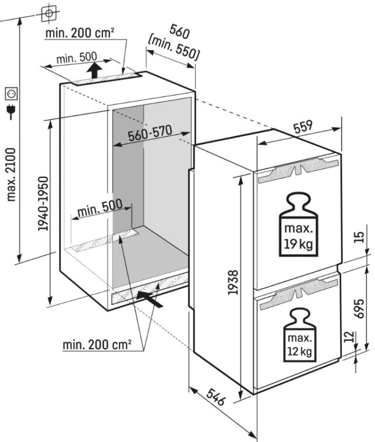 Vestavná kombinovaná chladnička o celkovém užitném objemu 285 l. Objem chladničky 215 l a objem mrazničky 70 l.