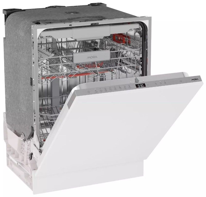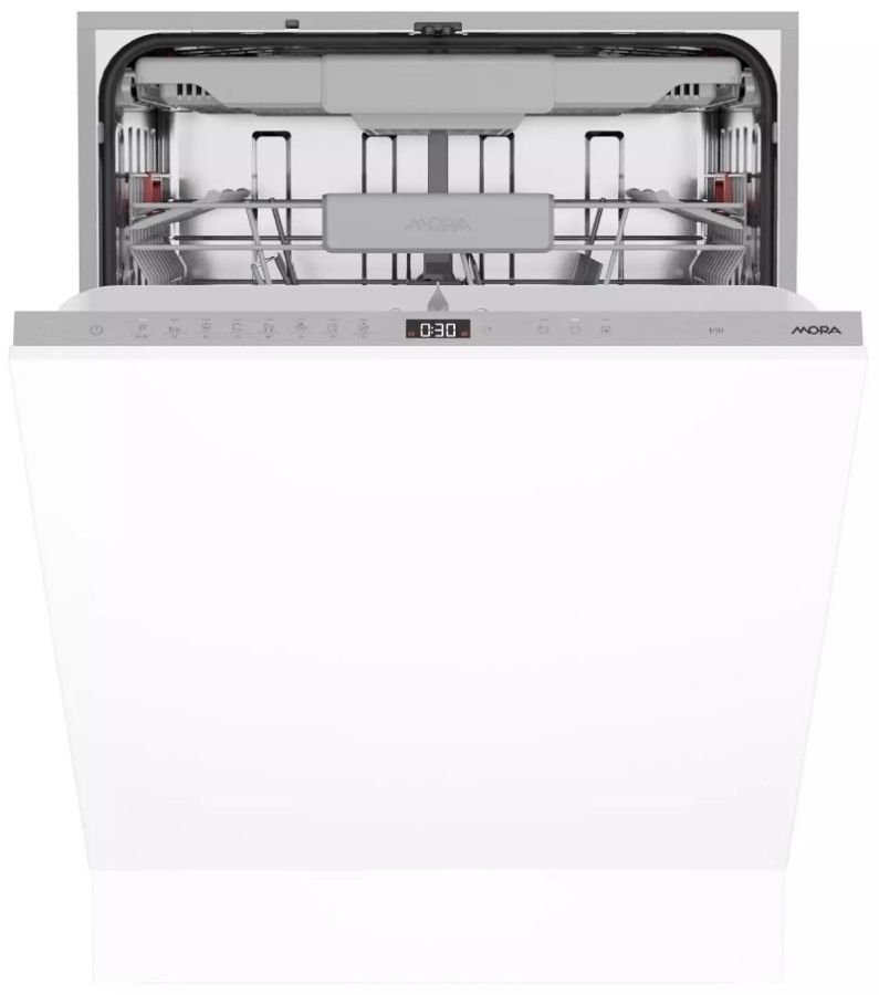 Vestavná plně integrovaná myčka MORA IMB 6675 v úsporné energetické třídě B si při standardní šířce 60 cm poradí s neuvěřitelnými 16 sadami nádobí. Nádobí dokonale umyje díky třem ostřikovacím ramenům a pěti výškovým úrovním proudu vody, takže bude bezvadně čisté, i když bude myčka opravdu plná a nádobí bude hustě naskládané. Je vybavená třemi koši s pohyblivými prvky a přizpůsobitelným nastavením. Vodící lišty v horním koši jsou navíc opatřeny kuličkovými ložisky. Horní koš slouží pro pečlivé a šetrné mytí příborů a kuchyňského náčiní, levý a pravý panel můžete posouvat podle toho, jak velký prostor v horním koši potřebujete. V horním a spodním koši najdete prostor i pro vyšší skleničky na víno. Speciální pryžový materiál je udrží v pevné poloze. Tyto držáky jsou flexibilní a dělitelné, s vyhrazeným prostorem pro různý počet sklenic, aby vyhovovaly vašim potřebám. Skrytý ovládací panel je opatřen dotykovým ovládáním s displejem a mnoha praktickými funkcemi, jako je například RychléMytí, které umožňuje zkrátit délku vybraných programů. Speciální LED světlo instalované na spodní části dvířek myčky neustále indikuje aktuální fázi mycího programu. Vždy tak víte, zda myčka funguje nebo je mycí cyklus u konce. Zvolíte-li funkci SušeníPlus, po ukončení programu se automaticky pootevřou dvířka, aby tak unikla pára a následný sušicí cyklus byl efektivnější a energeticky úsporný. Energii pomáhá šetřit i možnost připojení přímo na teplou vodu pomocí speciální hadice, odolávající vysokým teplotám. Samozřejmostí je úsporný ECO Program nebo AUTO Program, který sám zvolí optimální parametry mytí. Vhod přijde i odložený start až o 24 hodin. Myčka má navíc praktický samočisticí filtr, a tak automaticky odstraní zbytky mastnoty a jídla ve filtru a zamezí nesprávnému chodu spotřebiče. Se systémem AquaStop se nemusíte obávat nemilého překvapení v podobě vytopení. Myčka je osazená novým výkonným invertorovým motorem a dokonce se i sama vyčistí – stačí jednou za měsíc pustit automatický program čiťtění, který vyčistí vanu, ostřikovací ramena i trysky.