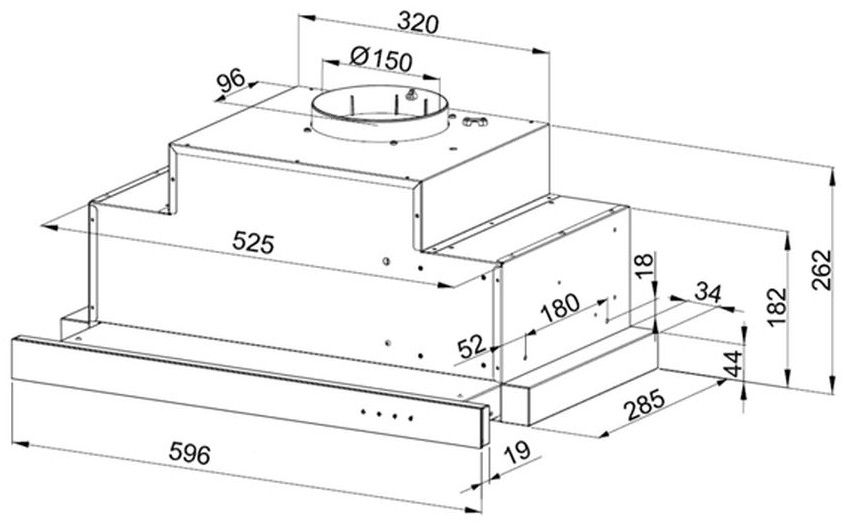 Vestavný odsavač se 3 rychlostmi výkonu, tlačítkovým ovládáním a možností odtahu i recirkulace. Výkon odsavače 632 m3/h.