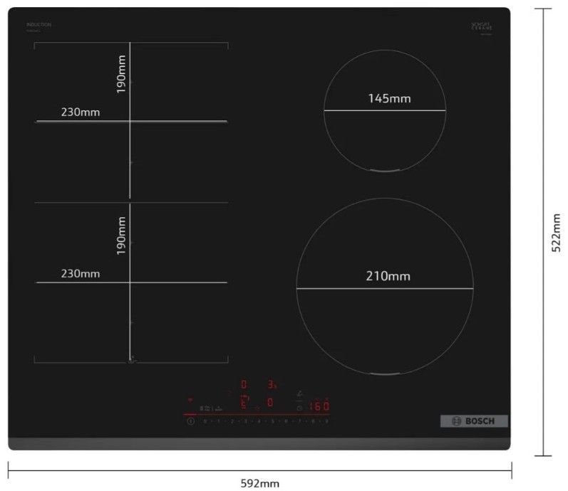 Rozměry varných zón: 2 x (19,0 x 23,0 cm), 1 x (14,5 cm Ø), 1 x (21,0 cm Ø)