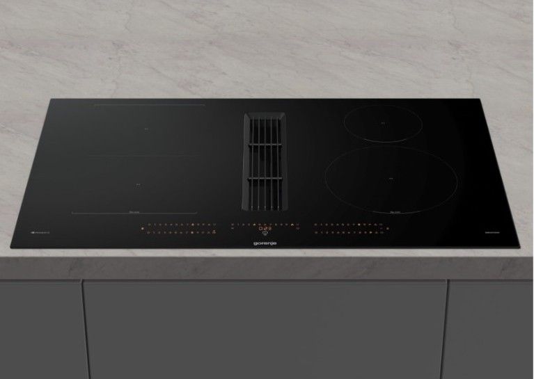 Indukční vestavná sklokeramická deska se zabudovaným odsavačem par, 4 indukčními zónami a dotykovým ovládáním.