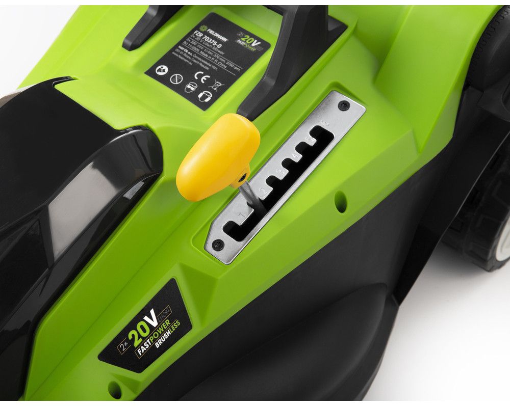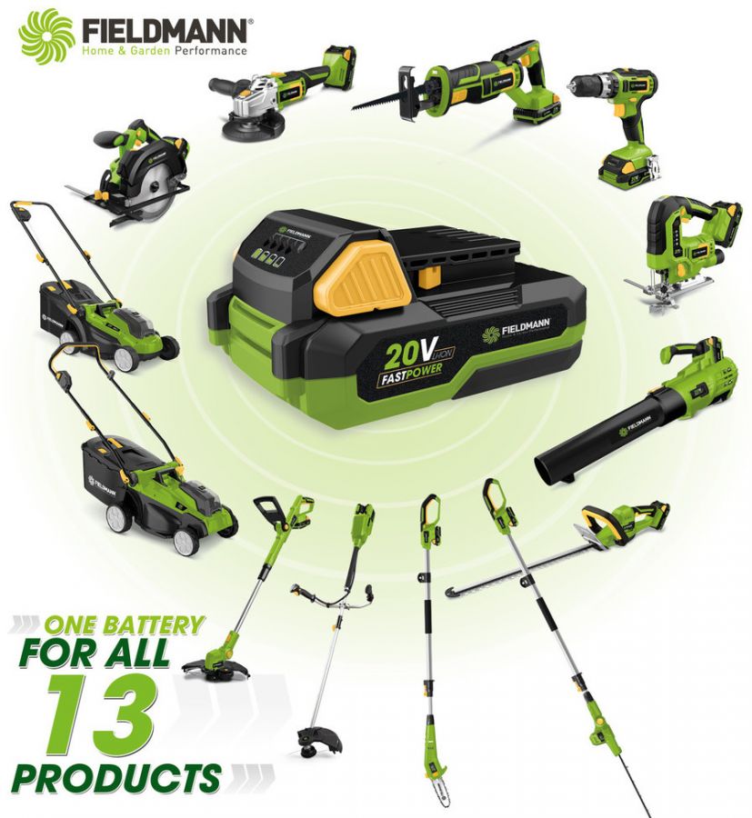 Sekačka dosahuje vysokého výkonu díky plnému využití síly 2x 20 V akumulátorů ve spojení s elektronickou řídící jednotkou. Je možno použít akumulátory o kapacitách 2 Ah / 4 Ah které jsou kompatibilní do všech výrobků společnosti FIELDMANN řady FAST POWER 20 V. Funkce mulčování ( součást balení mulčovací záslepka)
