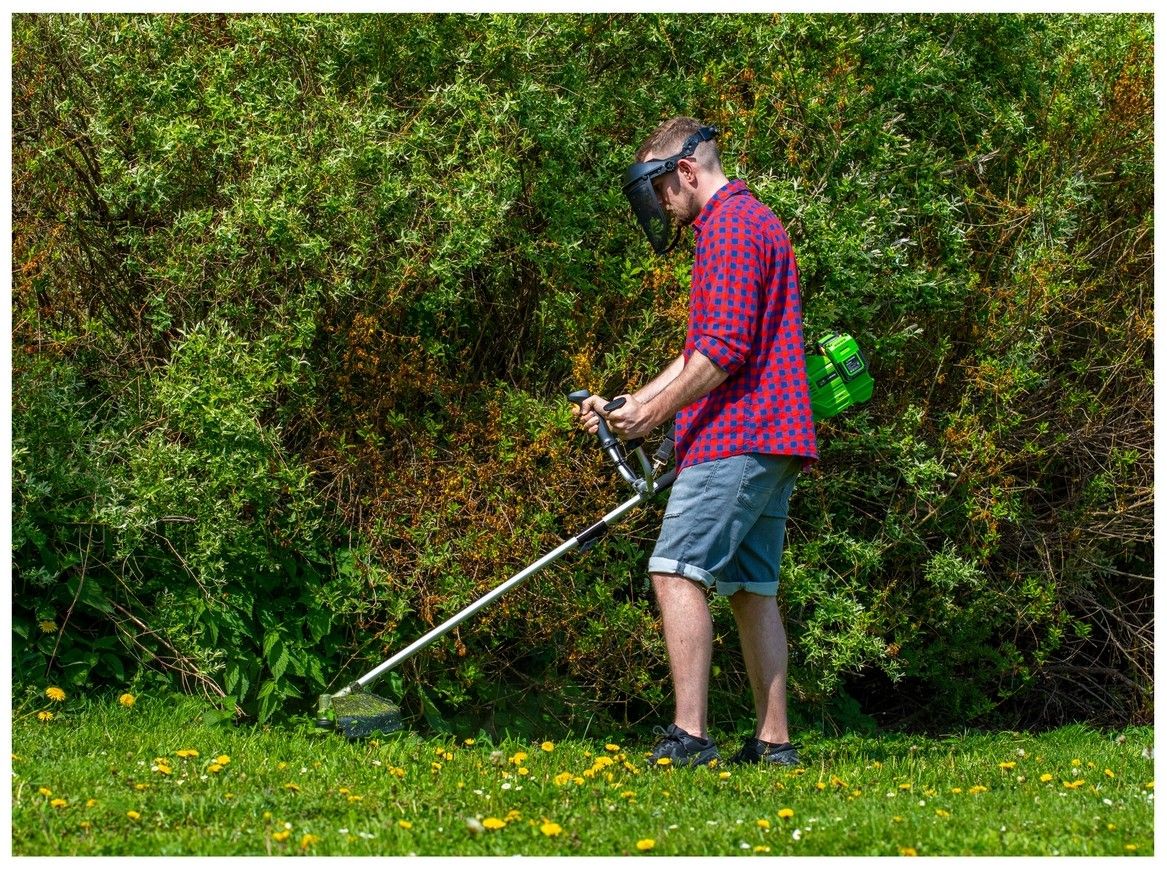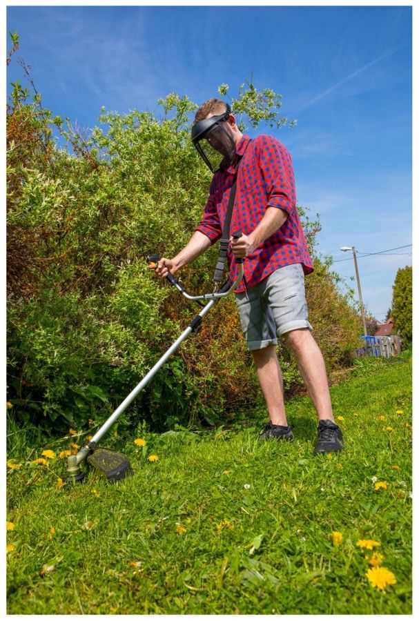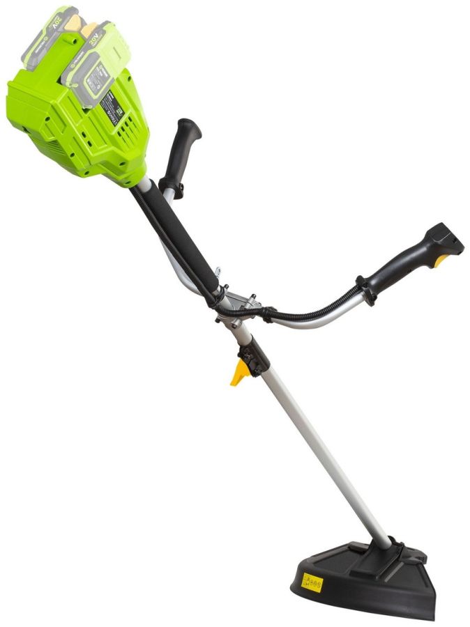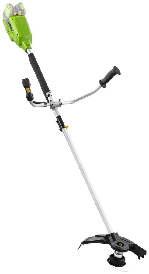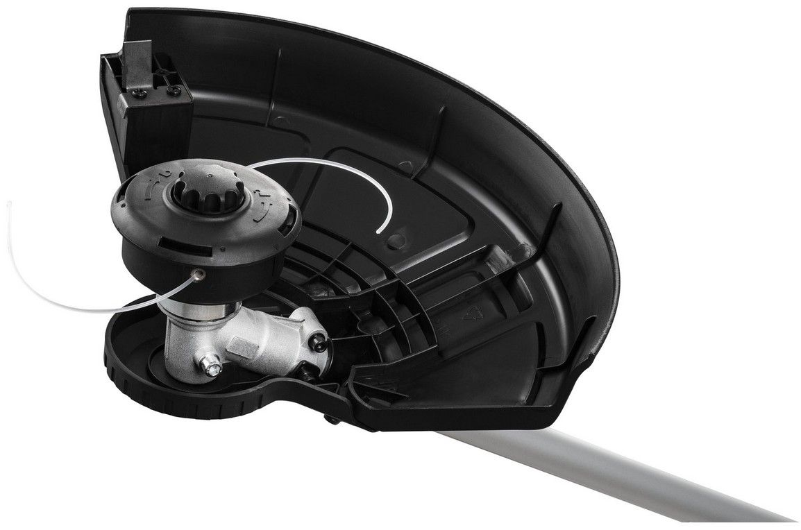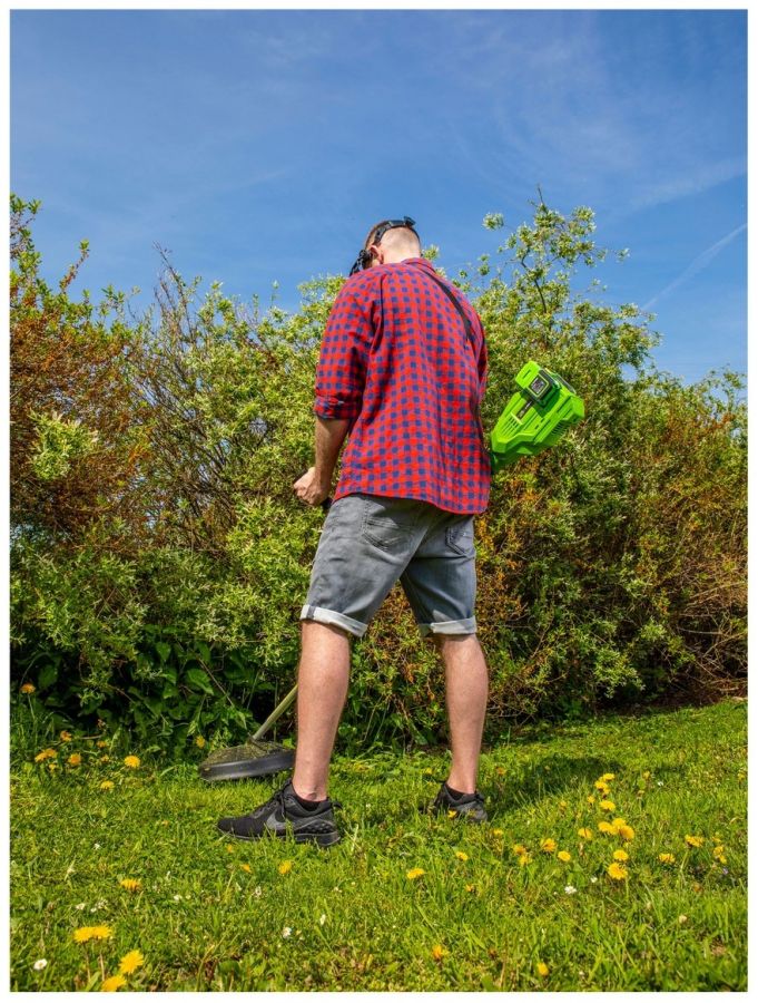 O komfortní práci se kromě měkčeného madla a dvojité ergonomické rukojeti stará též praktický ramenní popruh. V balení naleznete též třízubý vyžínací kotouč a strunovou hlavu. Motor umístěný u hlavy vyvažuje baterie na konci spojovací tyče, takže se s křovinořezem výborně manipuluje.