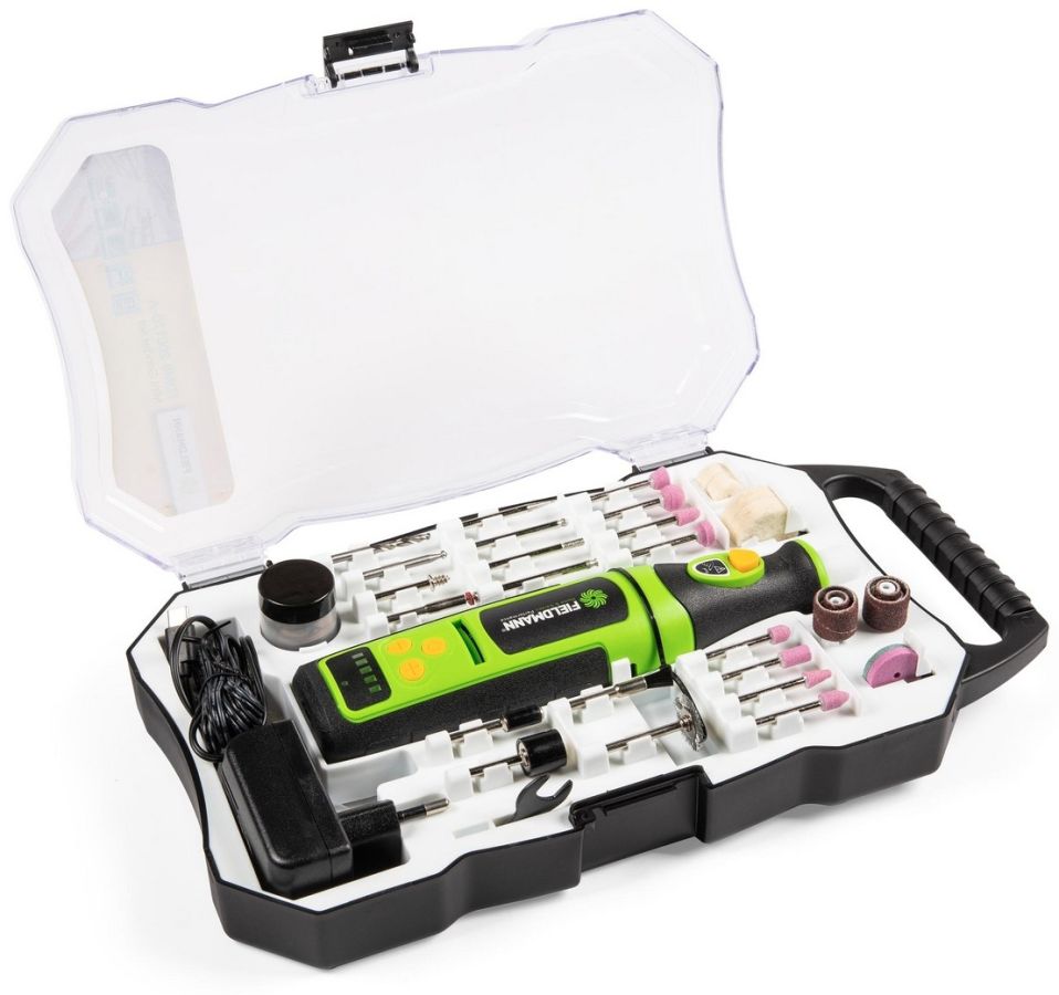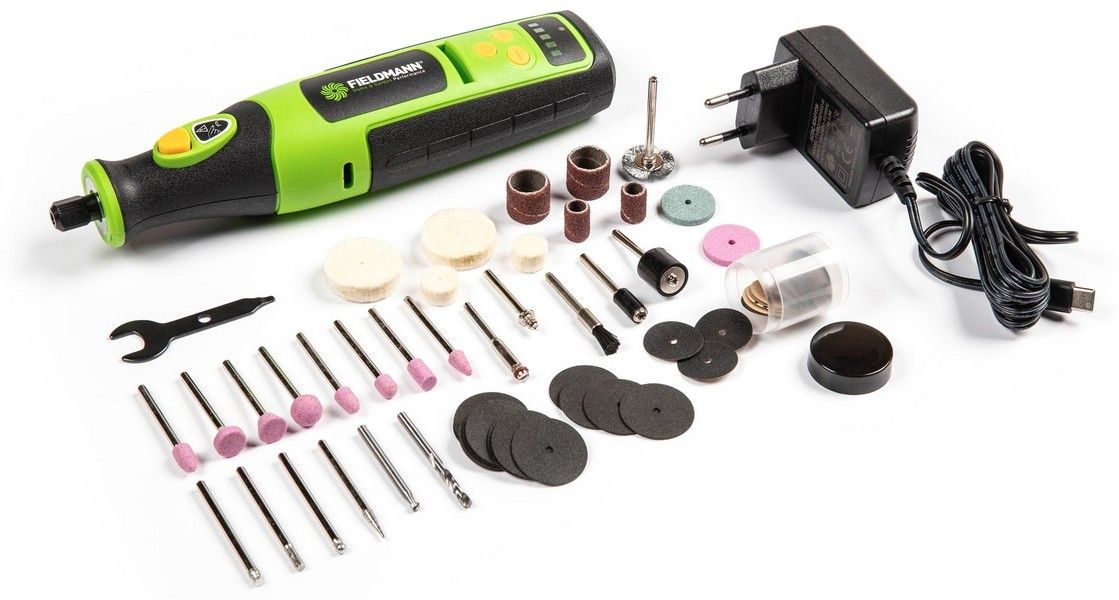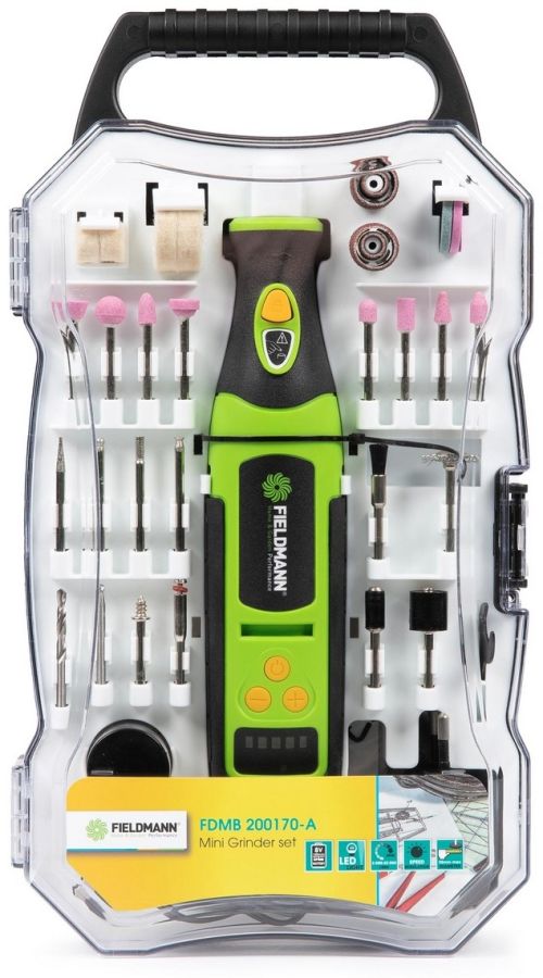 Skvěle propracovaná modelářská bruska ověřené značky FIELDMANN je všestranný univerzální nástroj pro domácí kutily, drobné řemeslníky i hobby nadšence. Jedná se o mini přímou brusku s regulací otáček. O dostatečný výkon se postará Li-Ion 7,2 V / 1,3 Ah akumulátor. Otáčky je možné regulovat v rozmezí 5 000 – 25 000 otáček za minutu. Je vhodná pro opracování jak měkkých, tak i tvrdých materiálů. Skvěle se drží a snadno i rychle v ní vyměníte pracovní nástavce. Oproti klasickým bruskám odpadá nutnost nošení kabelu a je možnost pracovat i v prostoru, kde není přístup k el. síti. Samozřejmostí je 70 kusů příslušenství zdarma. To vše doplněno o ergonomické madlo s měkčenou rukojetí.