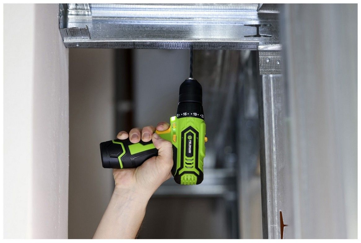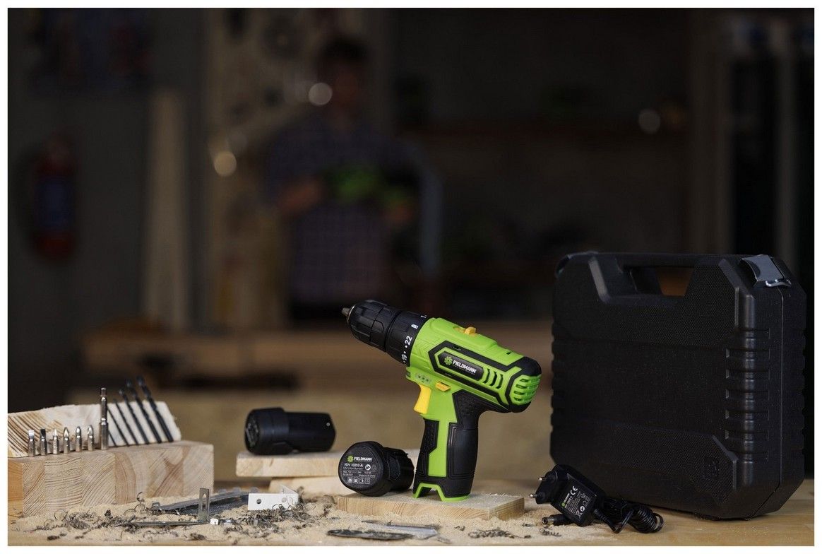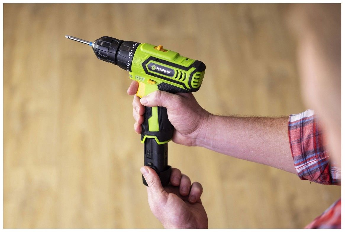 Akumulátorová vrtačka od renomovaného výrobce FIELDMANN zajistí maximálně pohodlné a rychlé vrtání / šroubování bez překážejícího kabelu. Dvourychlostní převodovka – ideální pro vrtání do dřeva, kovu nebo plastu. O komfortní práci se kromě ergonomické rukojeti ve které je zabudovaná baterie stará též pracovní LED světlo díky kterému bude jakákoliv práce v dílně snazší. Vrtačka je dodávaná v praktickém plastovém kufříku s nabíječkou a 2x 1,3 Ah akumulátorem, doplněným o 13 ks příslušenství.