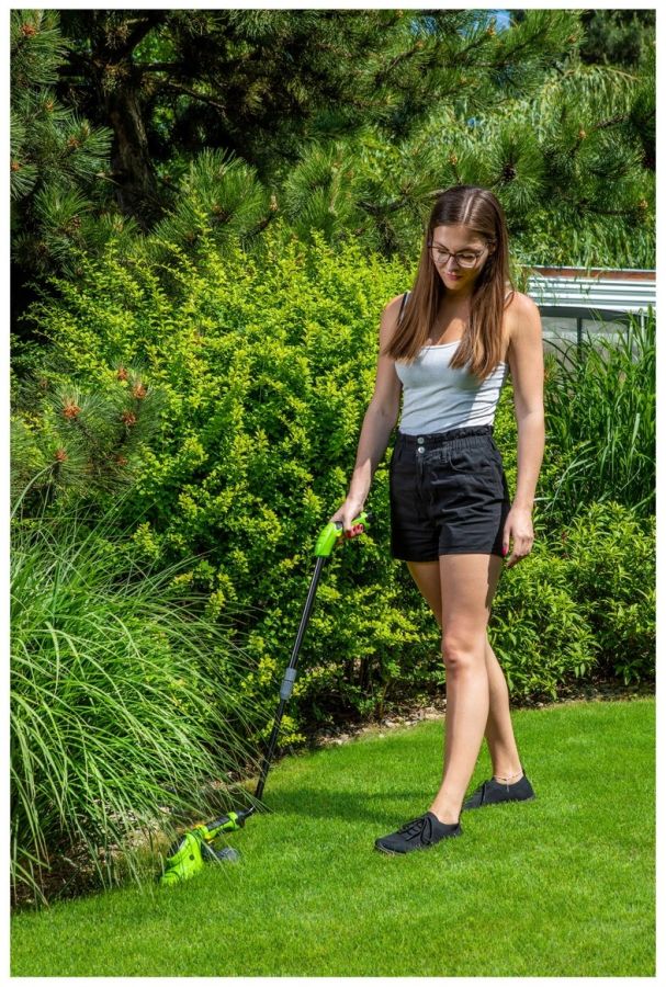 Systém bezpečnostních spínačů, který zabraňuje úrazům je samozřejmostí. Součástí balení jsou dvě kvalitní lišty. Jedna se hodí na úpravu trávy a druhá na keře. Získáváte tedy dva nástroje za cenu jednoho. Největším bonusem nůžek je ovšem teleskopická rukojeť o délce 130 cm, plus vodicí odnímatelná kolečka. Při snaze o perfektní trávník se tak už nemusíte ohýbat. Vše zvládnete udělat ve stoje a dáváte tak sbohem bolavým zádům.