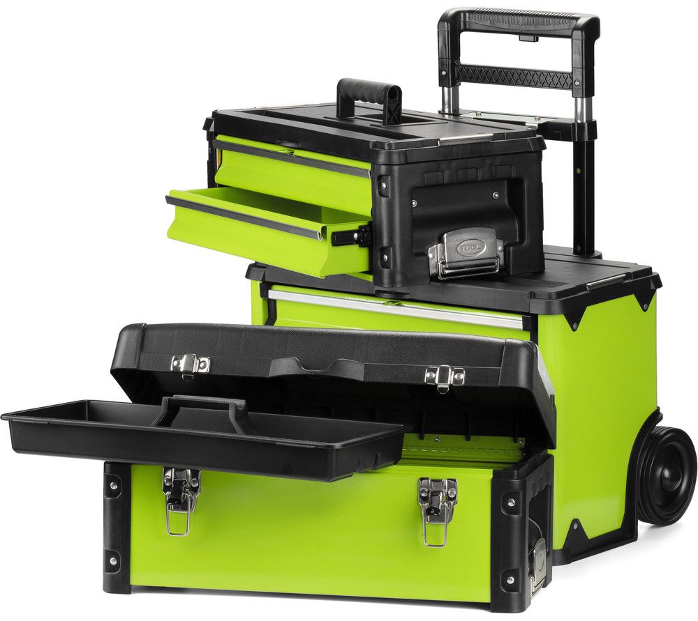Jednotlivé části boxu jsou členěny tak, aby měl každý nástroj či materiál své místo a uživatel nemusel ztrácet čas zdlouhavým hledáním. V menších přihrádkách ve víku horního boxu uložíte drobný, např. spojovací materiál, o kterém budete mít perfektní přehled díky krytu z průhledného pevného plastu. Vyjímatelná plastová přihrádka s rukojetí pak pojme další drobnosti a nářadí a v boxu zbyde ještě dost prostoru na větší nástroje. Druhý díl nabízí dvě výsuvné zásuvky s dostatkem místa např. pro sadu nejčastěji používaných šroubováků nebo klíčů.