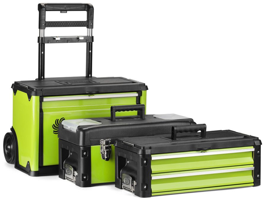 Spodní díl – velký úložný box s výklopným víkem – pak poskytuje opravdu velkorysý prostor pro pomocníky větších rozměrů, jakými jsou elektrický šroubovák, vrtačka, bruska apod. Všechny tři boxy jsou opatřeny vyklápěcími madly, aby je bylo možné přenášet i jednotlivě. Každý z nich je po stranách vybaven také bytelnými přezkami, kterými se mezi sebou vzájemně propojí v jeden pevný celek, aby byla zajištěna stabilita i bezpečnost celé sady při převážení. Robustní teleskopické madlo poslouží při převozu, při manipulaci s jednotlivými částmi ale nebude překážet. Kolečka z tvrzeného plastu zaručují dlouhou životnost celého boxu.
